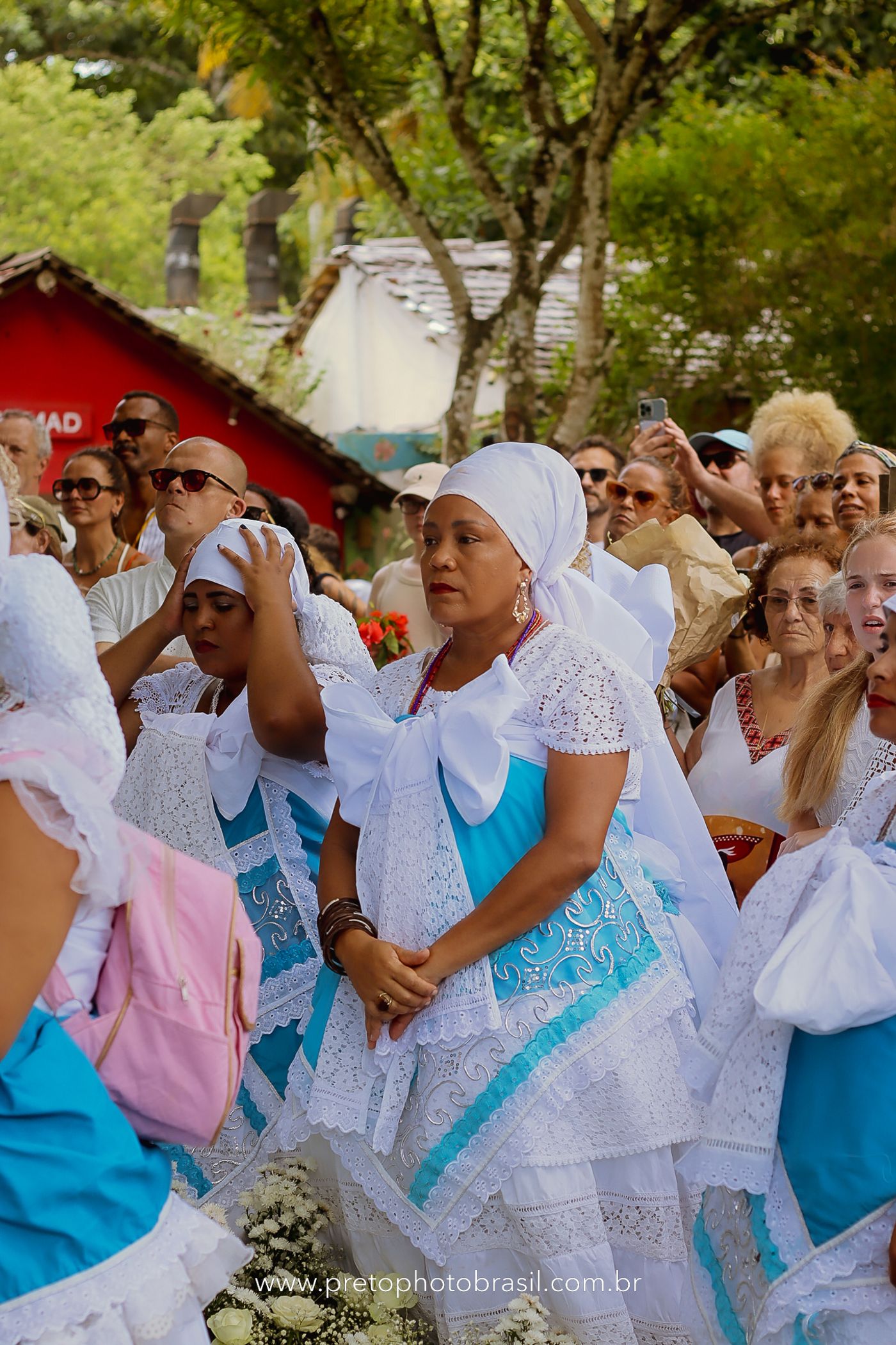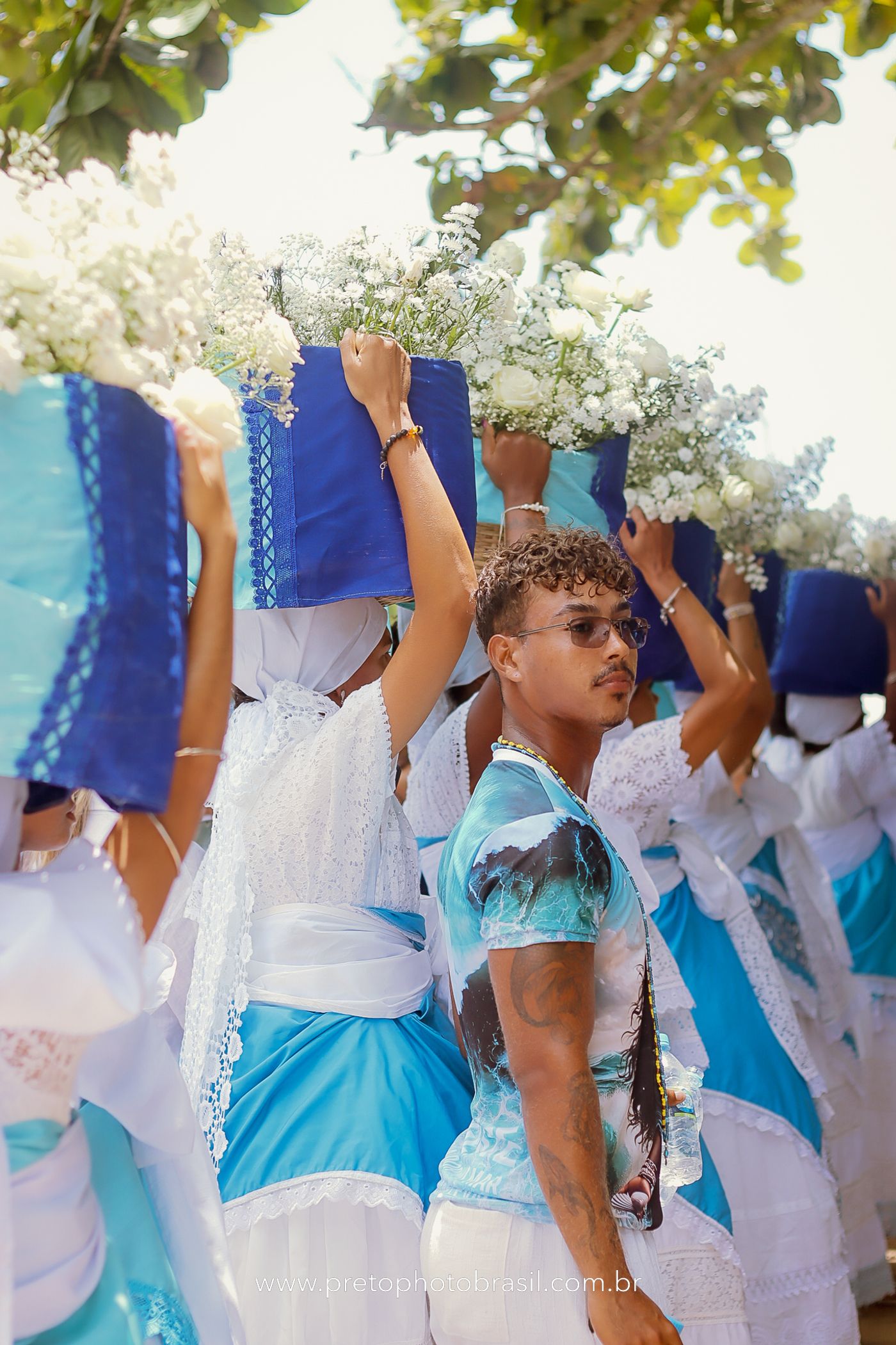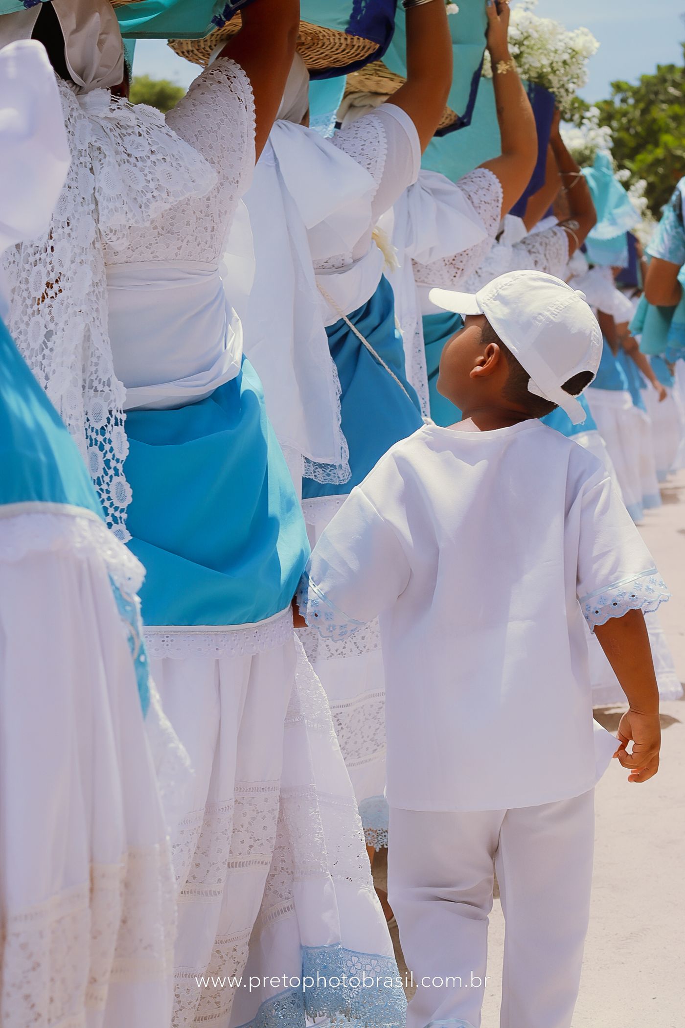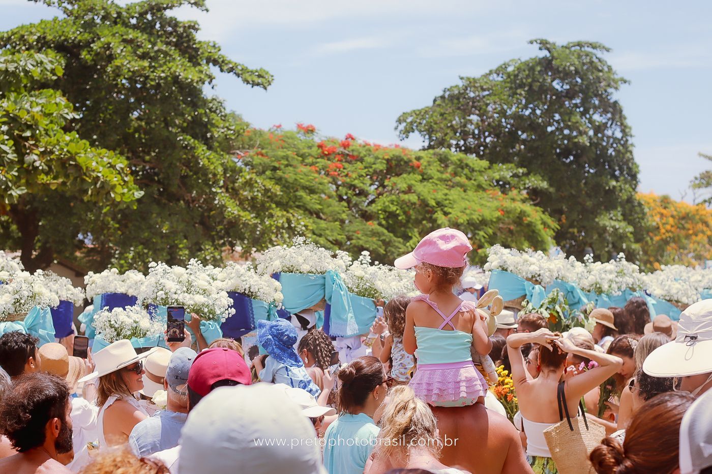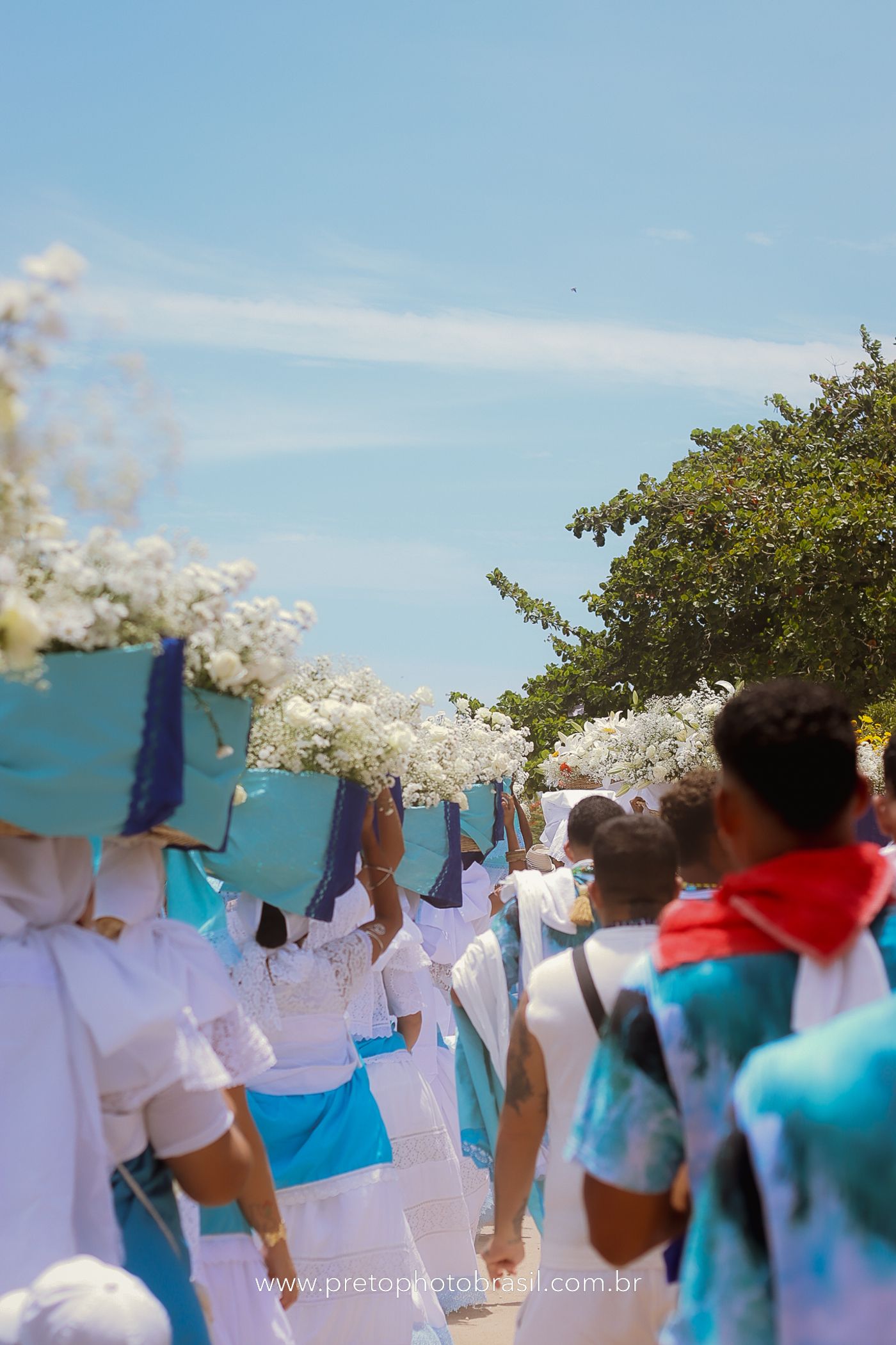 Descrição: Hoje, Trancoso foi tomada por um caminhar antigo e vivo. As baianas saíram em cortejo, com passos firmes e delicados, levando nos braços e sobre a cabeça cestos de flores brancas e azuis — oferendas de amor, fé e gratidão. O caminho até a praia não foi apenas físico: foi ritual. O terreiro do Pai Roni conduziu a celebração com respeito e força ancestral. Entre cantos, silêncios e sorrisos, a multidão se formou naturalmente — gente de todo canto, unida por um mesmo gesto de entrega. Havia muita gente, mas não havia pressa. Havia fé. Havia alegria. Na chegada ao mar, as flores encontraram o destino certo. Foram entregues às águas como quem devolve algo sagrado à origem. Iemanjá recebeu — no azul do céu, no branco das roupas, no brilho tranquilo dos olhos de quem participou. Foi um dia de corpo presente e espírito aberto. Uma festa que não se assiste: se atravessa. E eu tive a honra de registrar, em imagens, esse encontro entre tradição, devoção e vida pulsando junto.