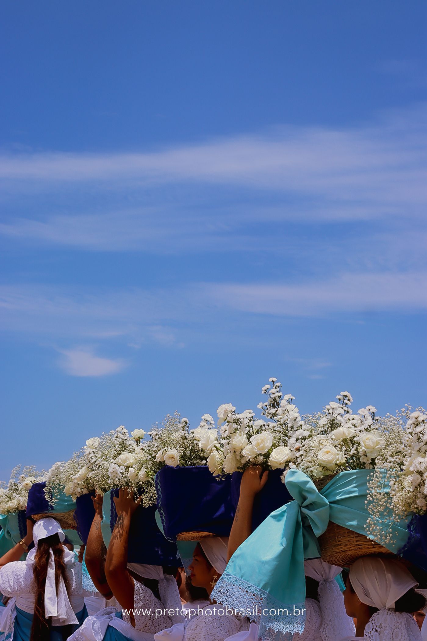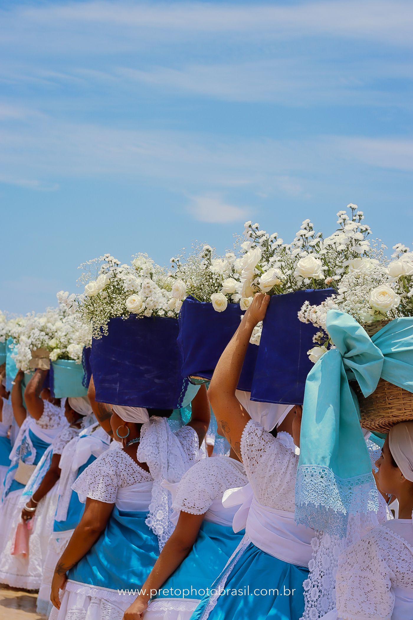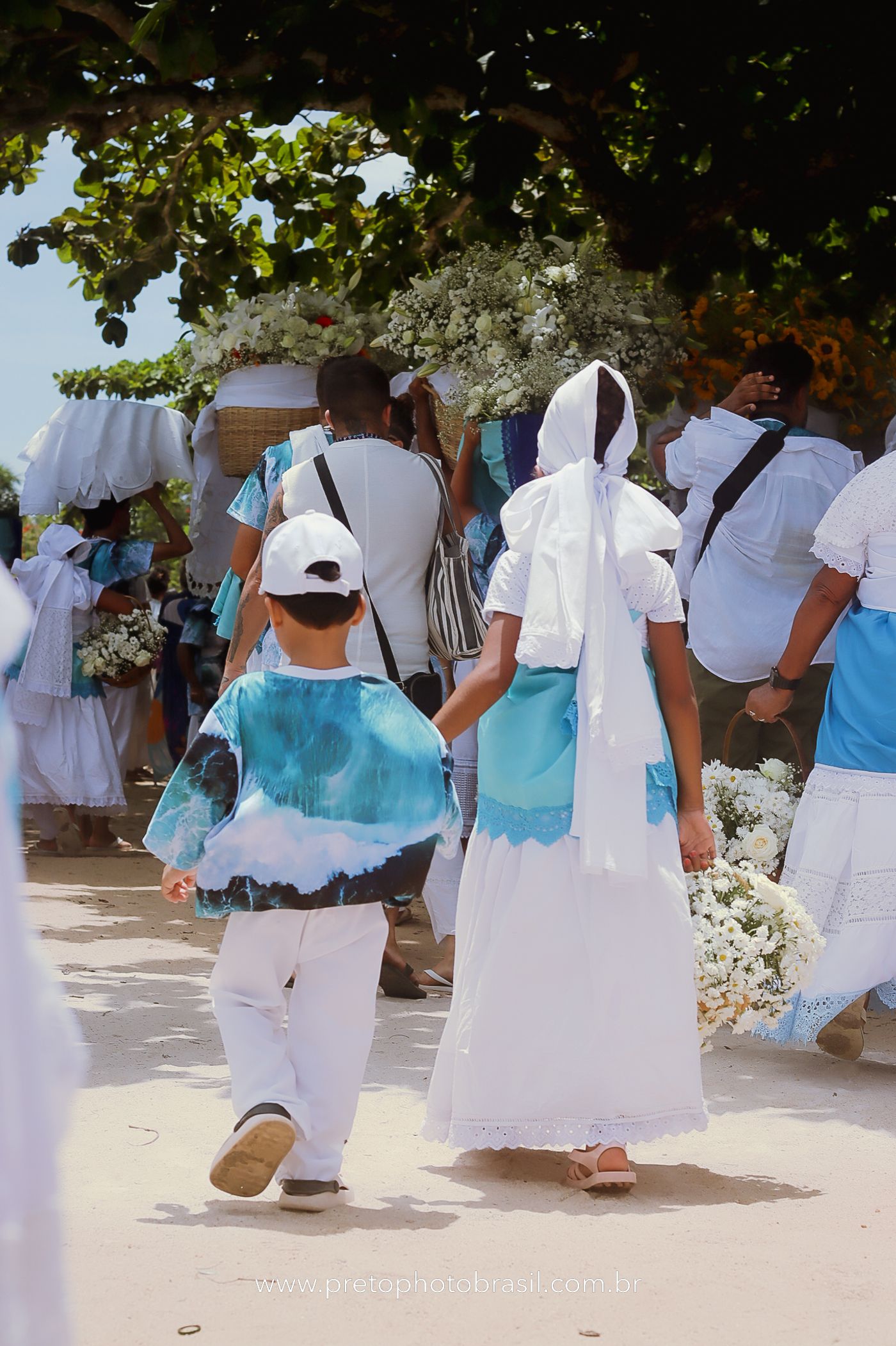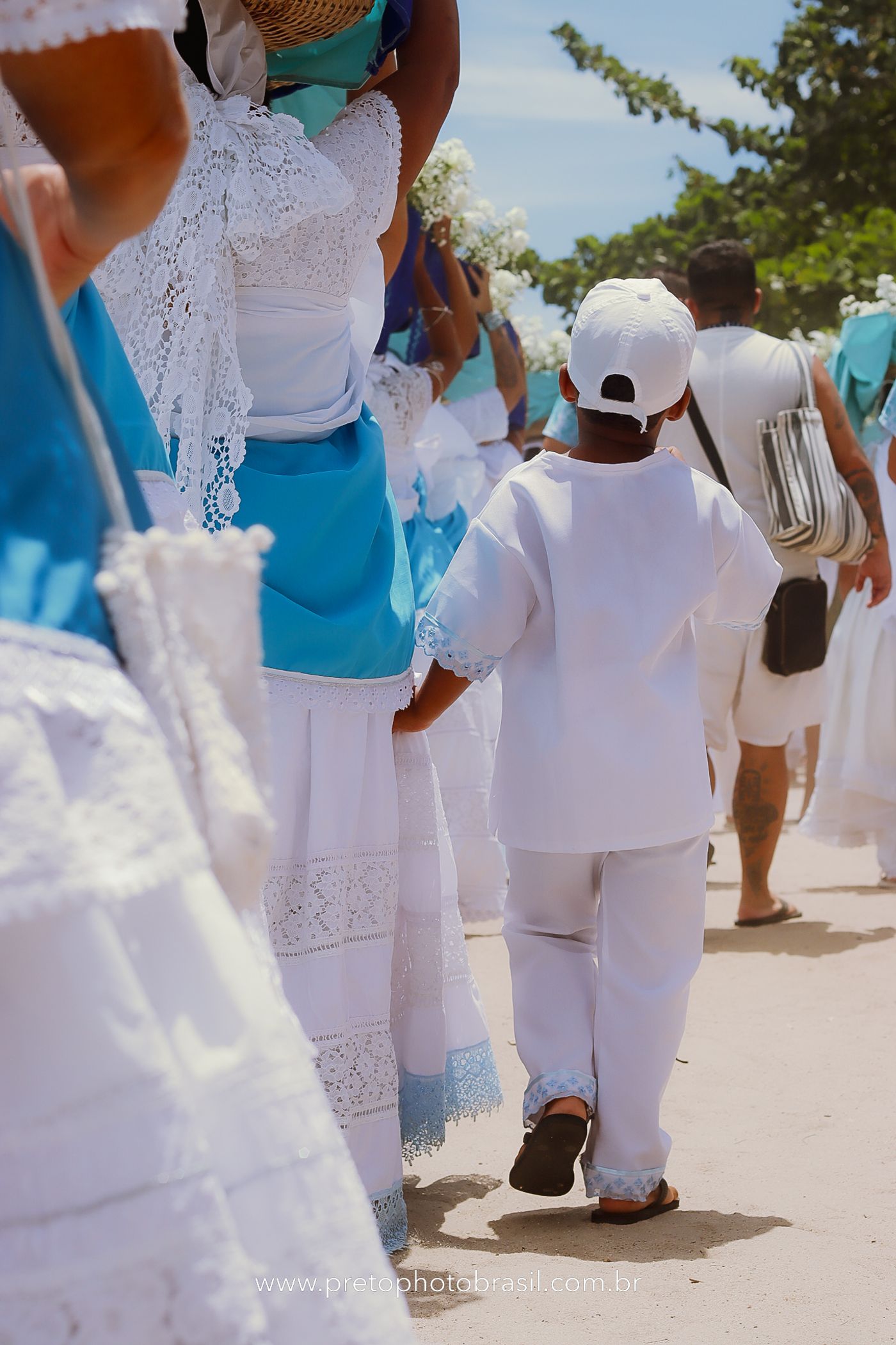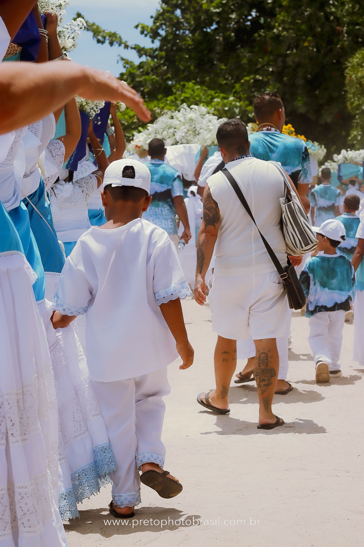 Descrição: Hoje, Trancoso foi tomada por um caminhar antigo e vivo. As baianas saíram em cortejo, com passos firmes e delicados, levando nos braços e sobre a cabeça cestos de flores brancas e azuis — oferendas de amor, fé e gratidão. O caminho até a praia não foi apenas físico: foi ritual. O terreiro do Pai Roni conduziu a celebração com respeito e força ancestral. Entre cantos, silêncios e sorrisos, a multidão se formou naturalmente — gente de todo canto, unida por um mesmo gesto de entrega. Havia muita gente, mas não havia pressa. Havia fé. Havia alegria. Na chegada ao mar, as flores encontraram o destino certo. Foram entregues às águas como quem devolve algo sagrado à origem. Iemanjá recebeu — no azul do céu, no branco das roupas, no brilho tranquilo dos olhos de quem participou. Foi um dia de corpo presente e espírito aberto. Uma festa que não se assiste: se atravessa. E eu tive a honra de registrar, em imagens, esse encontro entre tradição, devoção e vida pulsando junto.