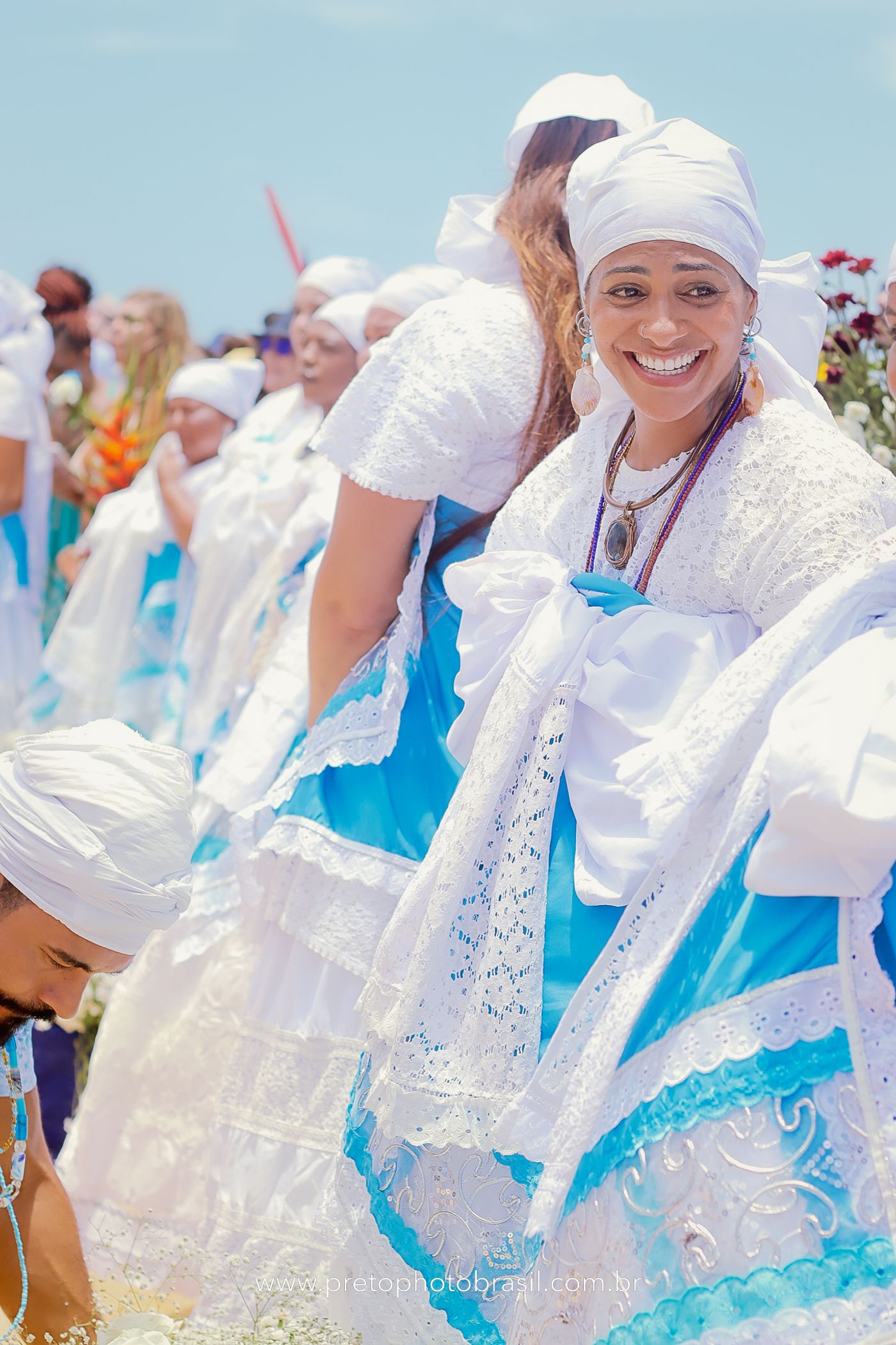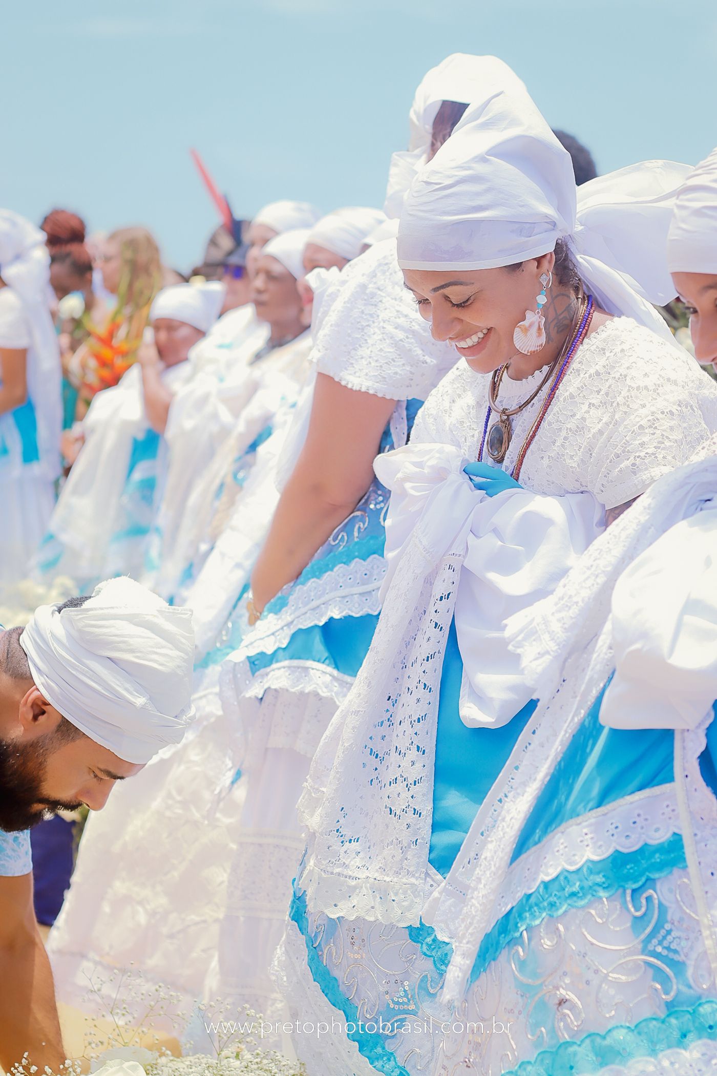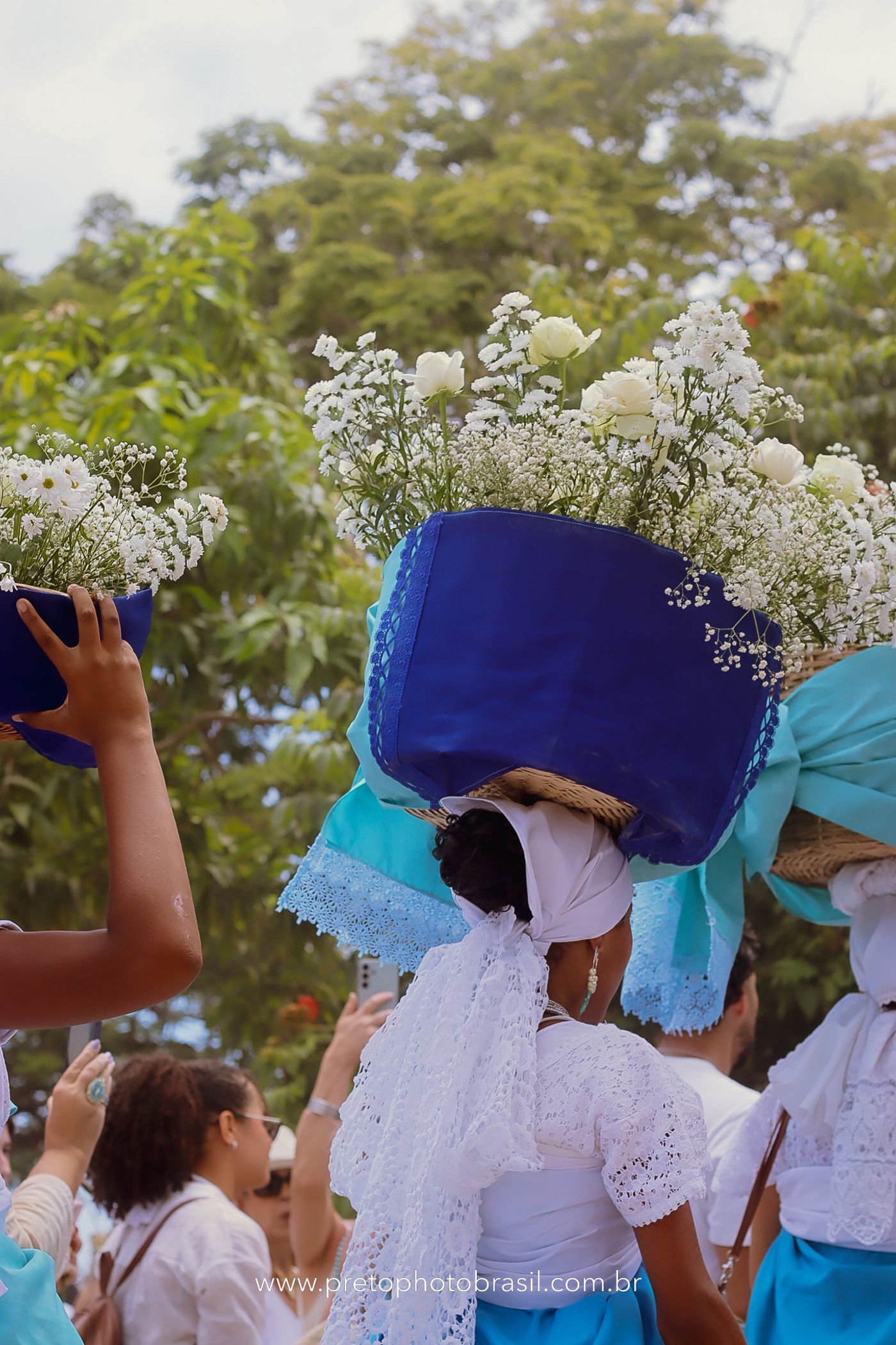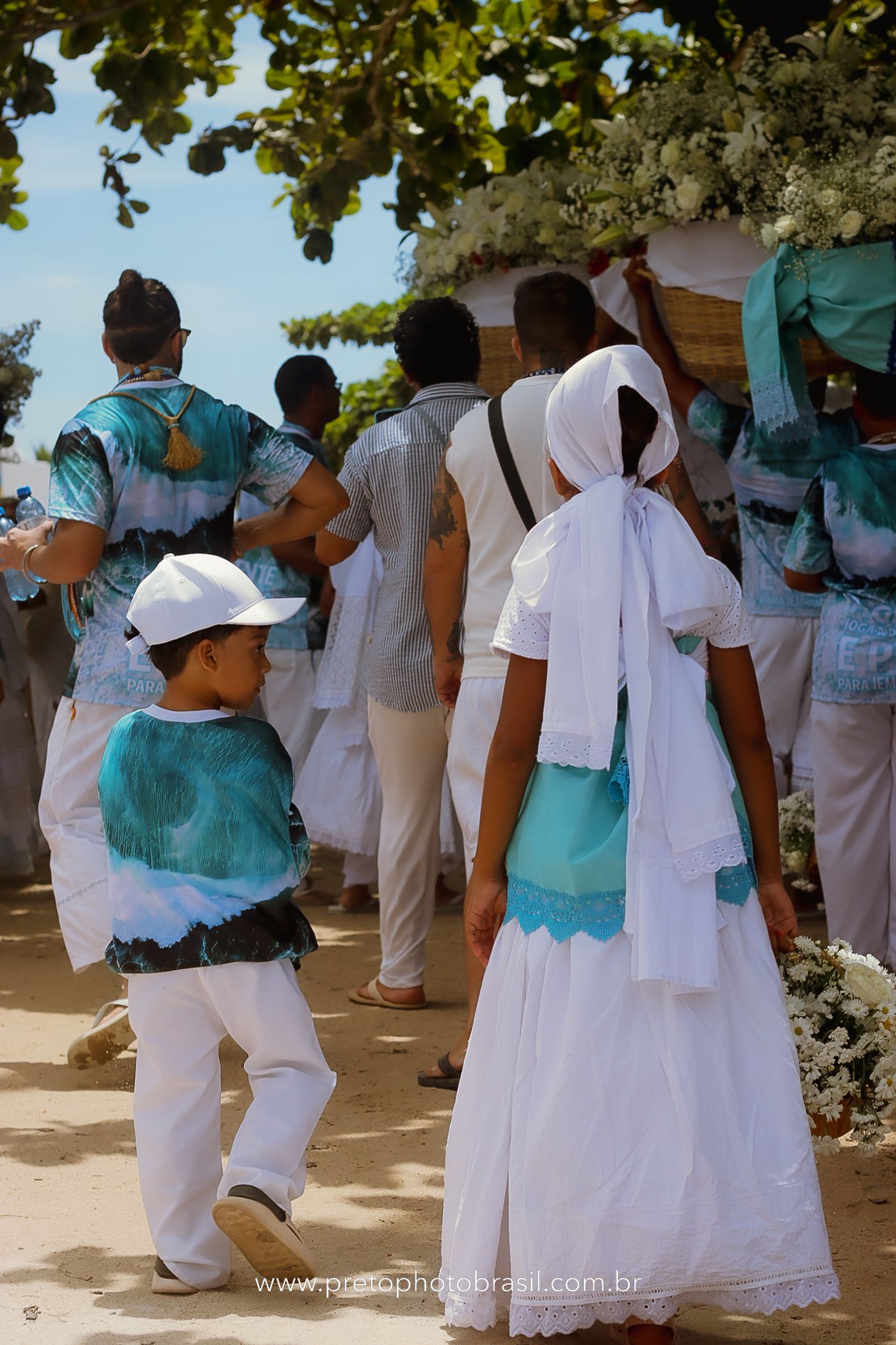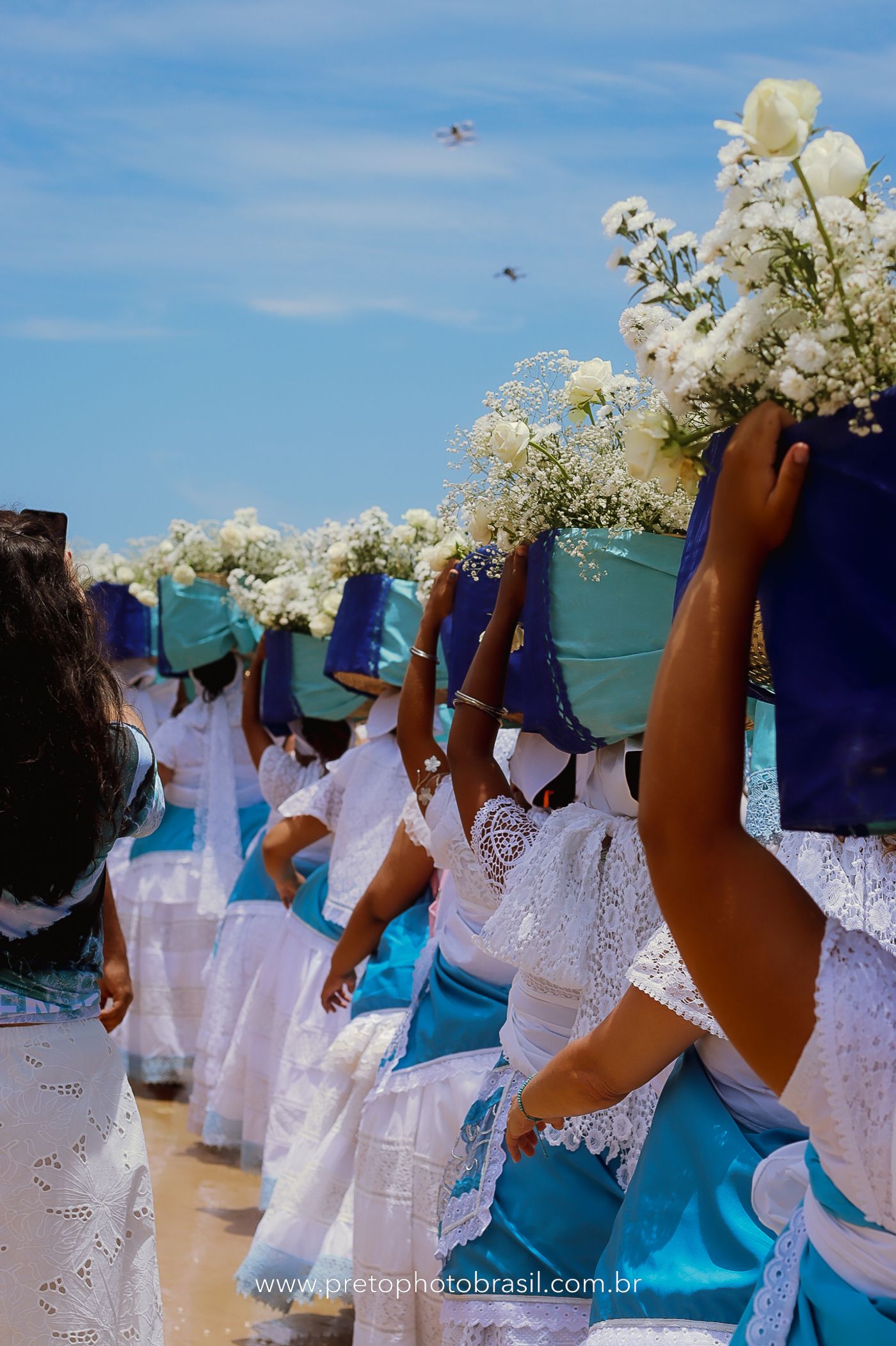 Descrição: Hoje, Trancoso foi tomada por um caminhar antigo e vivo. As baianas saíram em cortejo, com passos firmes e delicados, levando nos braços e sobre a cabeça cestos de flores brancas e azuis — oferendas de amor, fé e gratidão. O caminho até a praia não foi apenas físico: foi ritual. O terreiro do Pai Roni conduziu a celebração com respeito e força ancestral. Entre cantos, silêncios e sorrisos, a multidão se formou naturalmente — gente de todo canto, unida por um mesmo gesto de entrega. Havia muita gente, mas não havia pressa. Havia fé. Havia alegria. Na chegada ao mar, as flores encontraram o destino certo. Foram entregues às águas como quem devolve algo sagrado à origem. Iemanjá recebeu — no azul do céu, no branco das roupas, no brilho tranquilo dos olhos de quem participou. Foi um dia de corpo presente e espírito aberto. Uma festa que não se assiste: se atravessa. E eu tive a honra de registrar, em imagens, esse encontro entre tradição, devoção e vida pulsando junto.