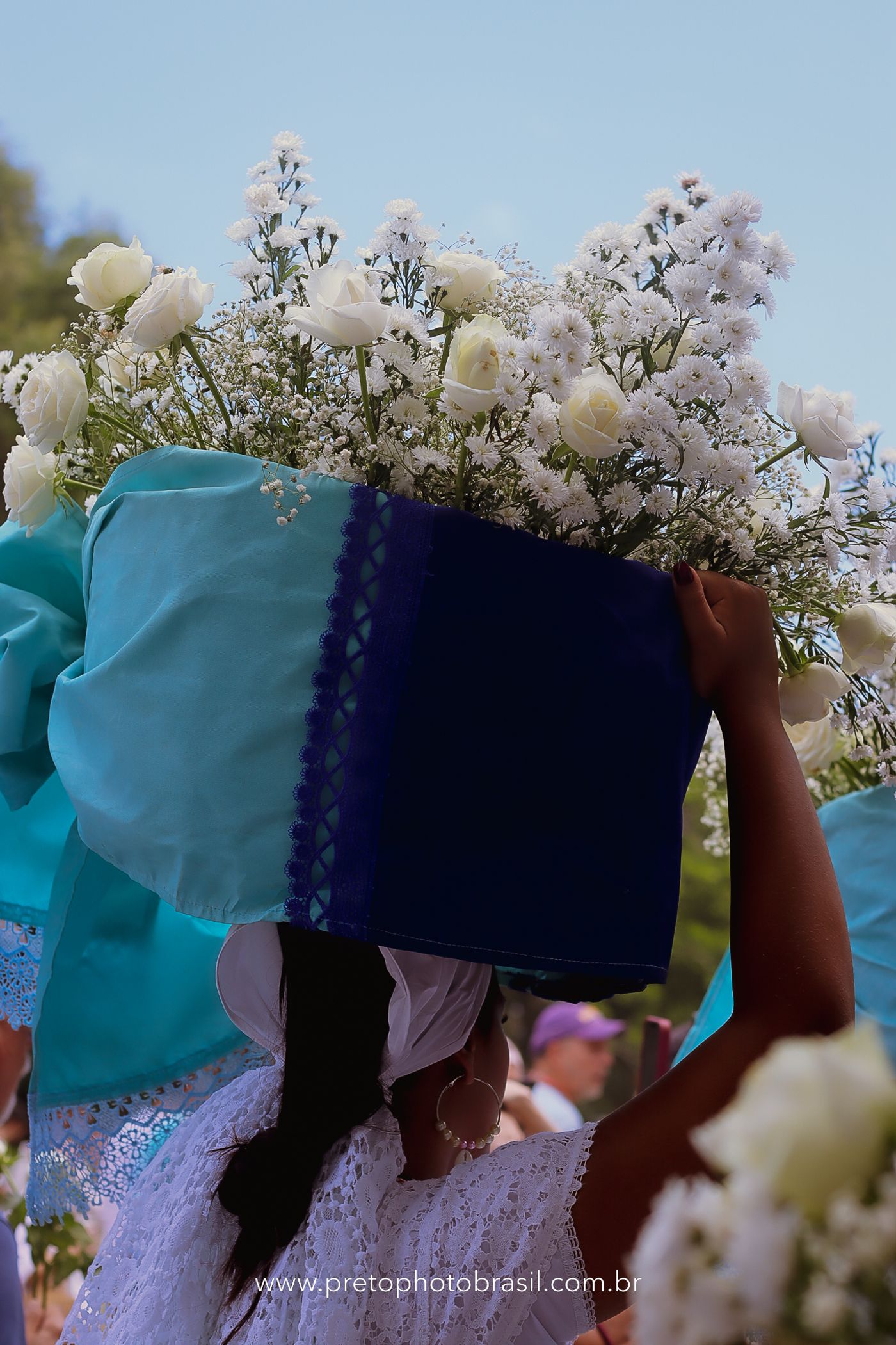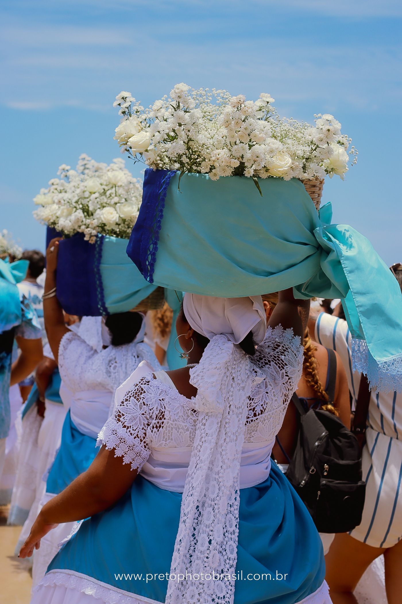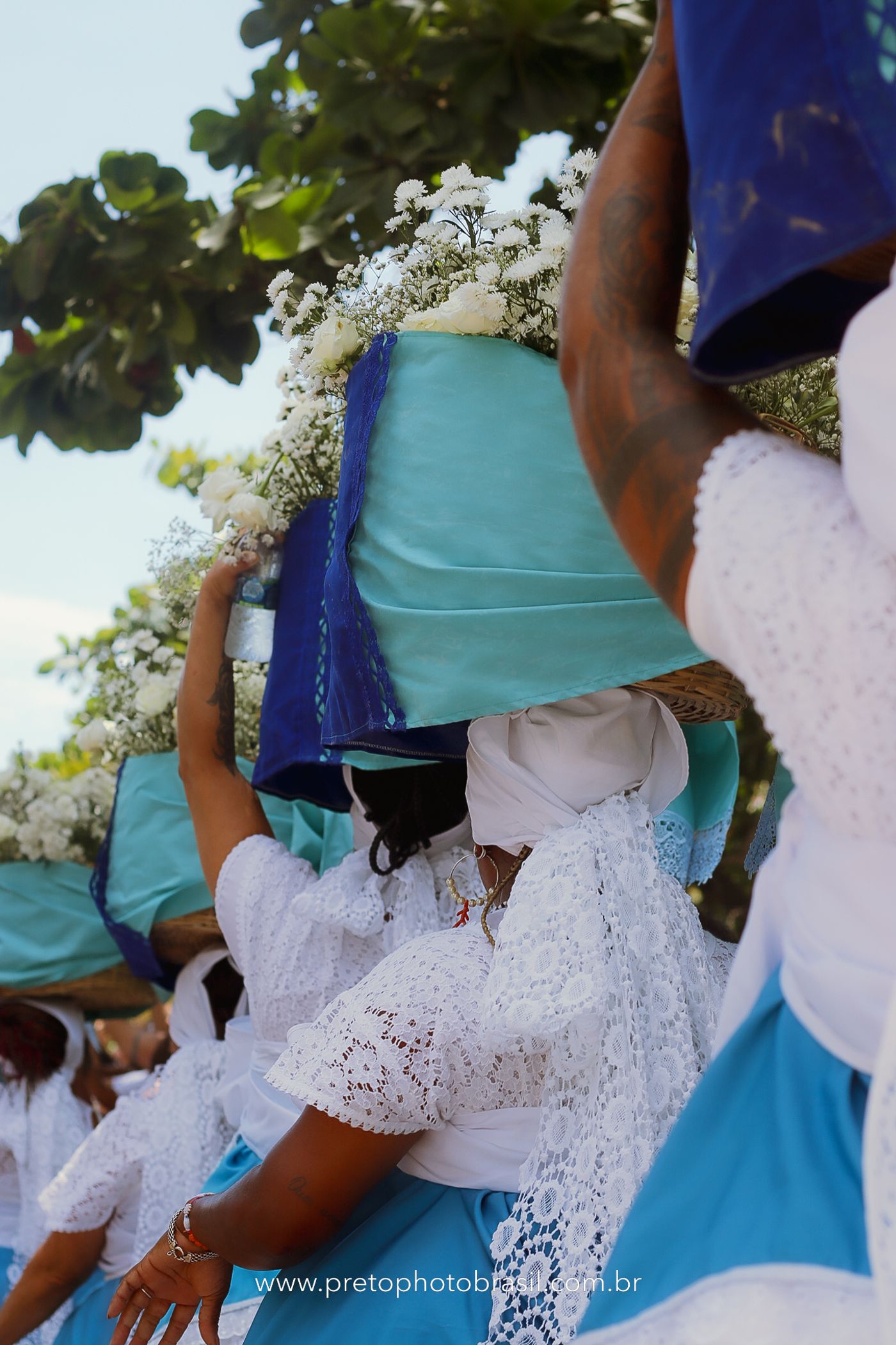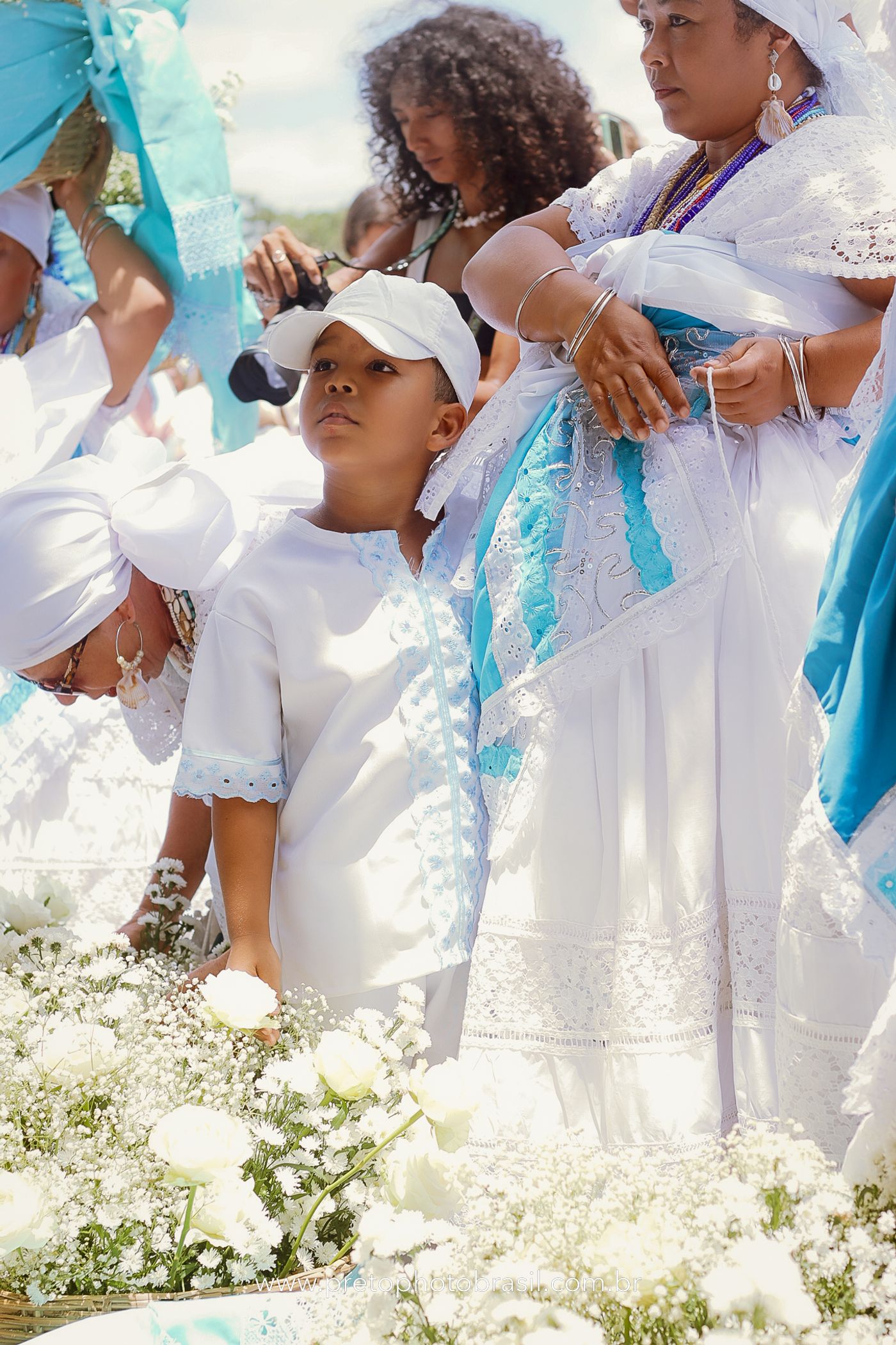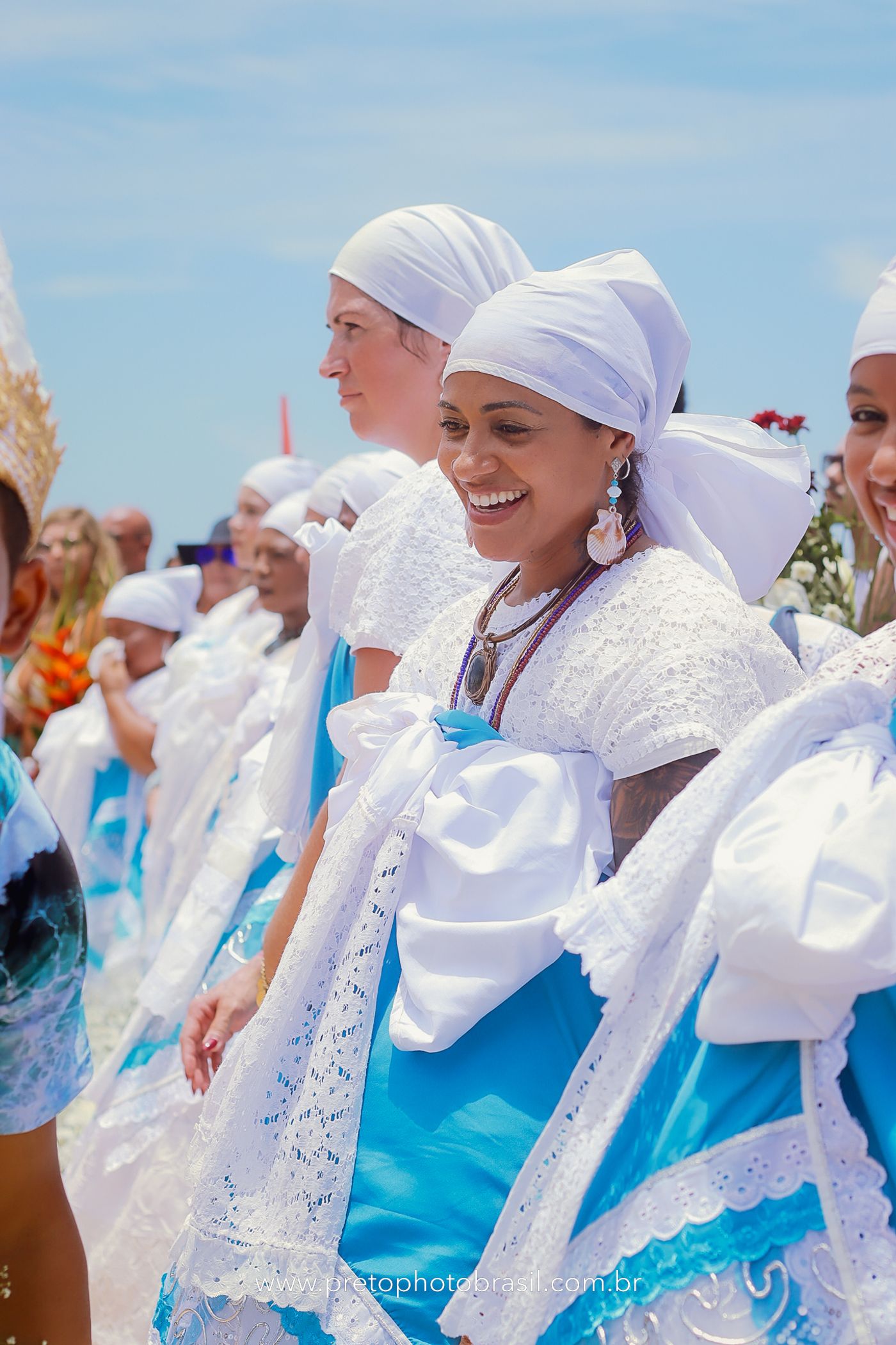 Descrição: Hoje, Trancoso foi tomada por um caminhar antigo e vivo. As baianas saíram em cortejo, com passos firmes e delicados, levando nos braços e sobre a cabeça cestos de flores brancas e azuis — oferendas de amor, fé e gratidão. O caminho até a praia não foi apenas físico: foi ritual. O terreiro do Pai Roni conduziu a celebração com respeito e força ancestral. Entre cantos, silêncios e sorrisos, a multidão se formou naturalmente — gente de todo canto, unida por um mesmo gesto de entrega. Havia muita gente, mas não havia pressa. Havia fé. Havia alegria. Na chegada ao mar, as flores encontraram o destino certo. Foram entregues às águas como quem devolve algo sagrado à origem. Iemanjá recebeu — no azul do céu, no branco das roupas, no brilho tranquilo dos olhos de quem participou. Foi um dia de corpo presente e espírito aberto. Uma festa que não se assiste: se atravessa. E eu tive a honra de registrar, em imagens, esse encontro entre tradição, devoção e vida pulsando junto.