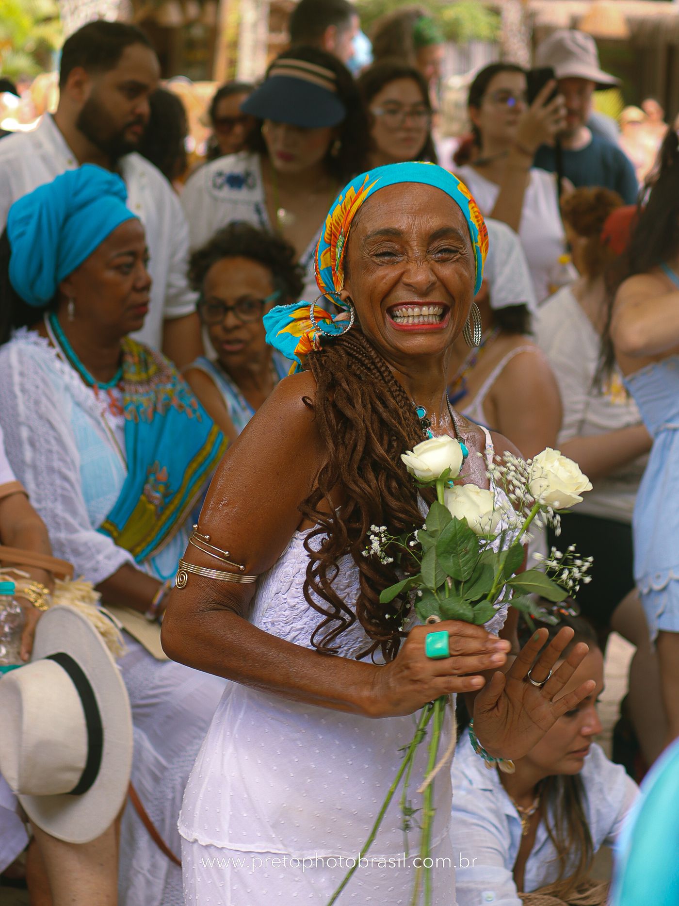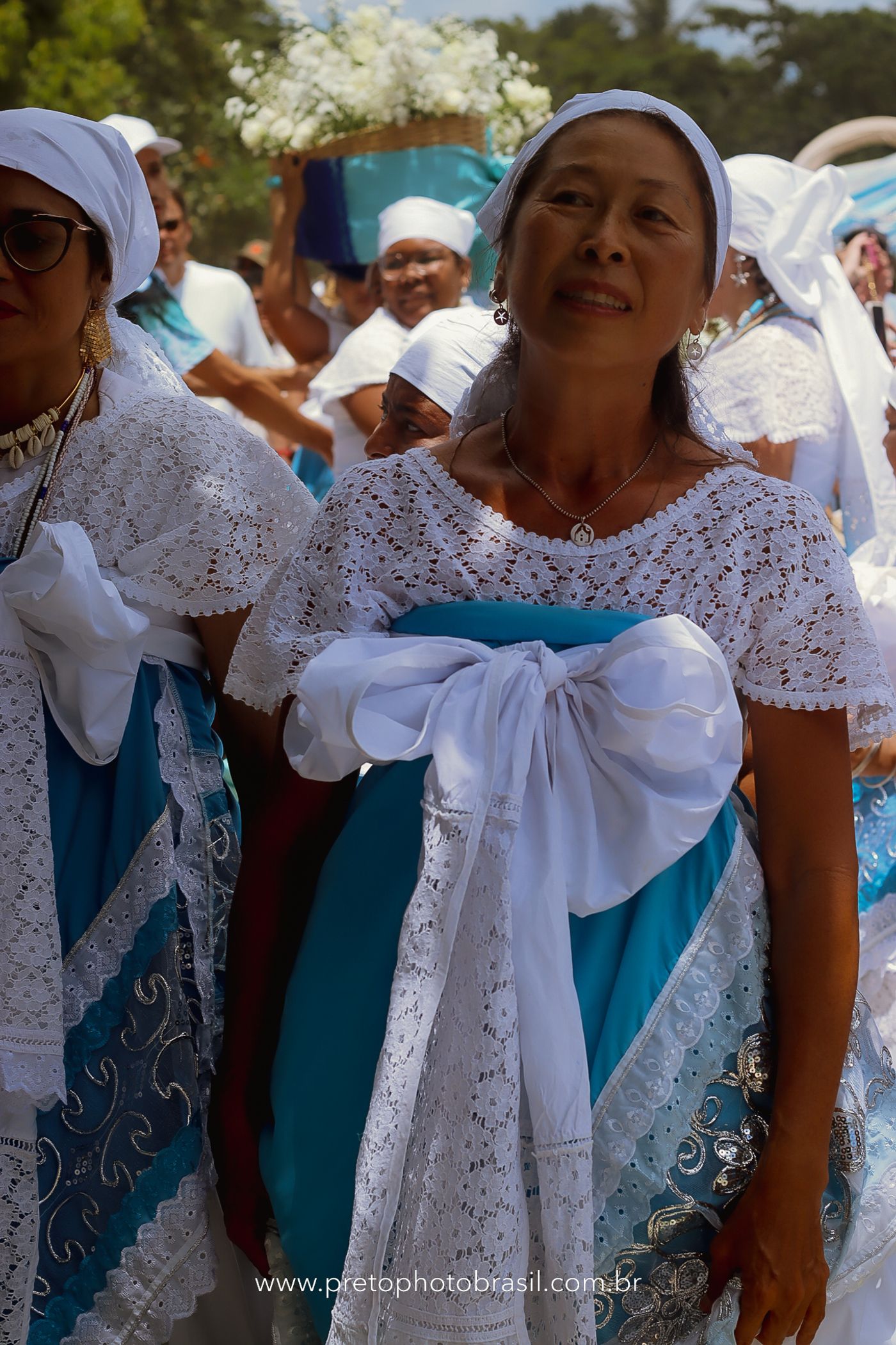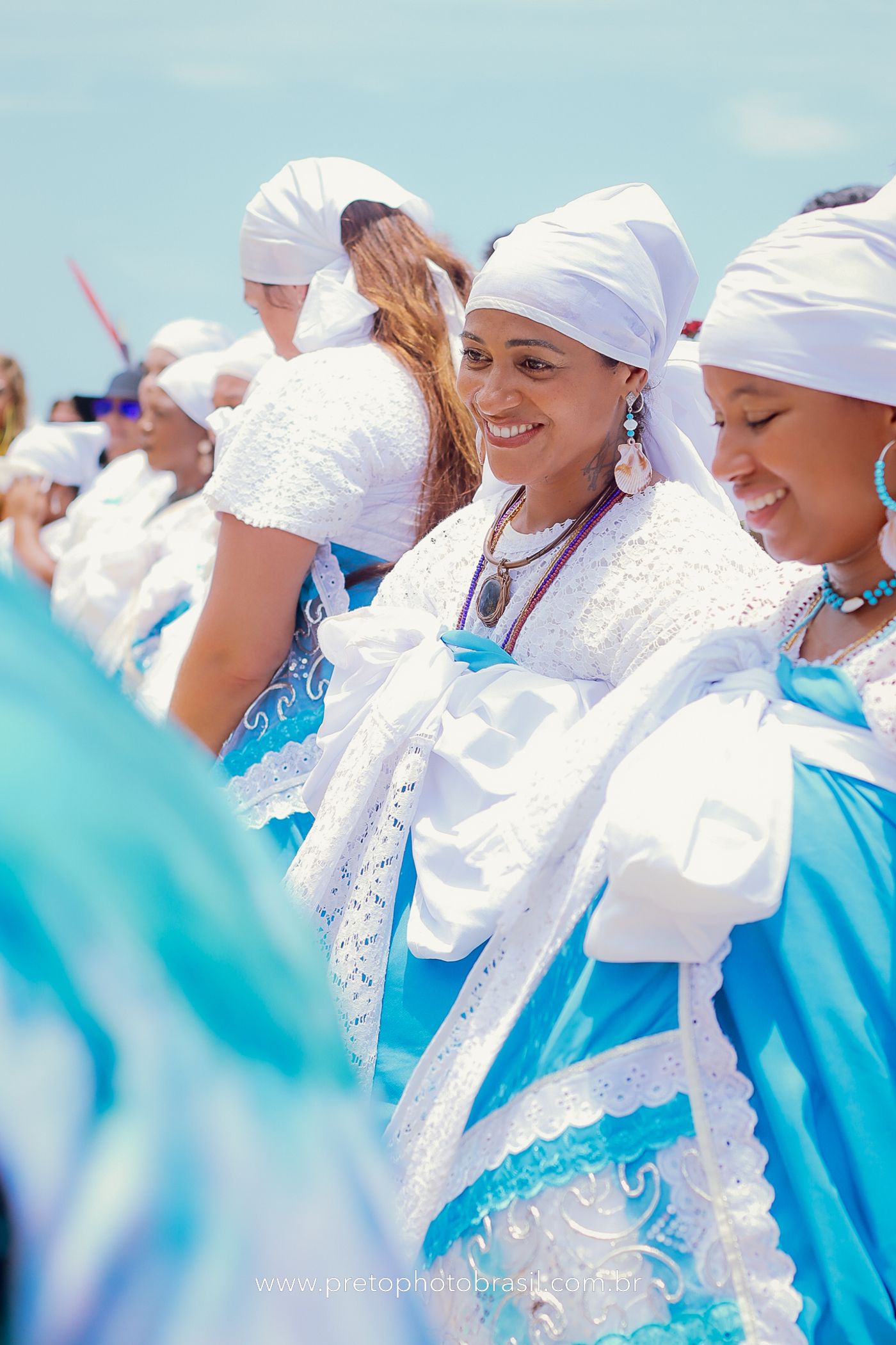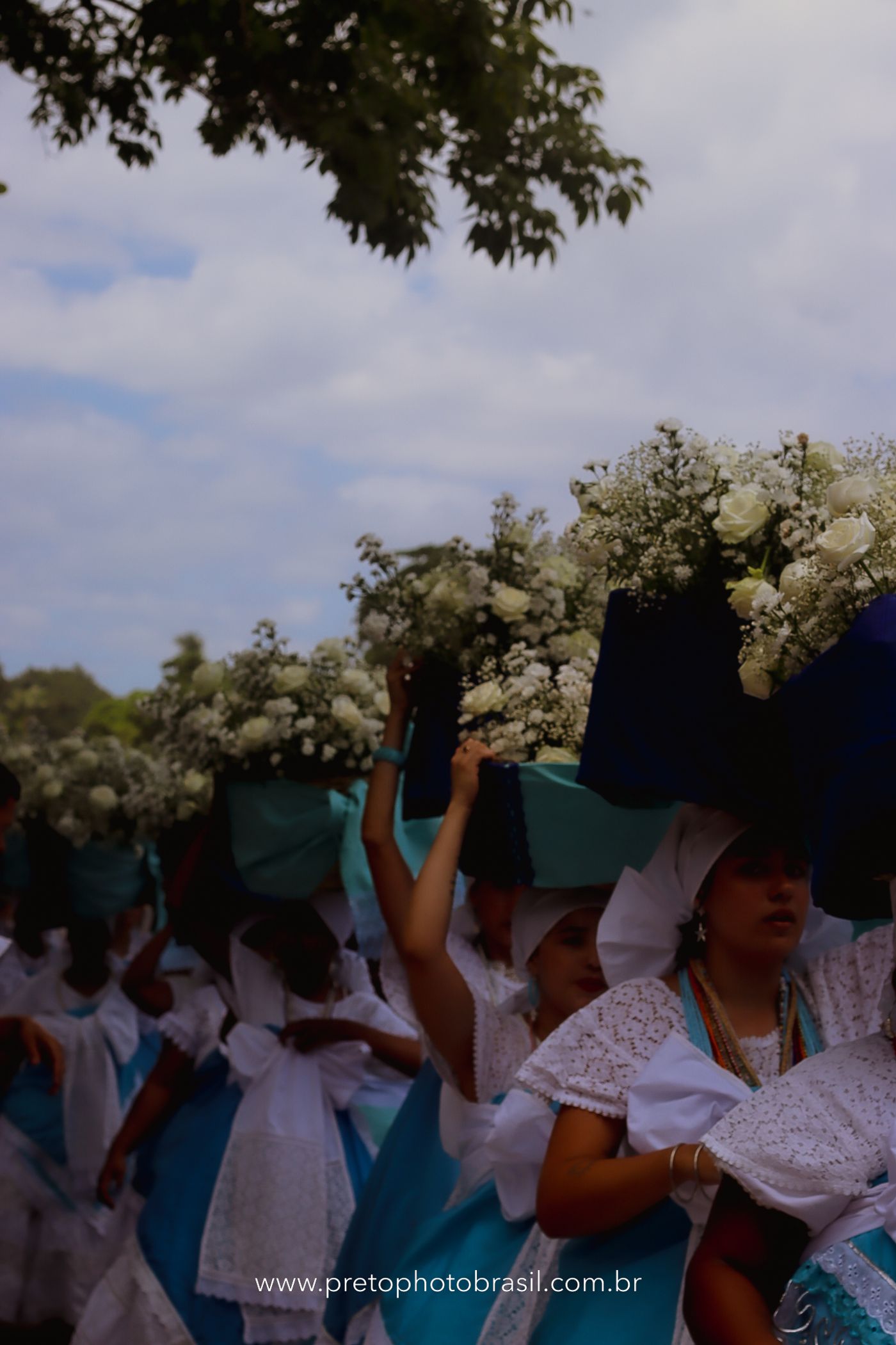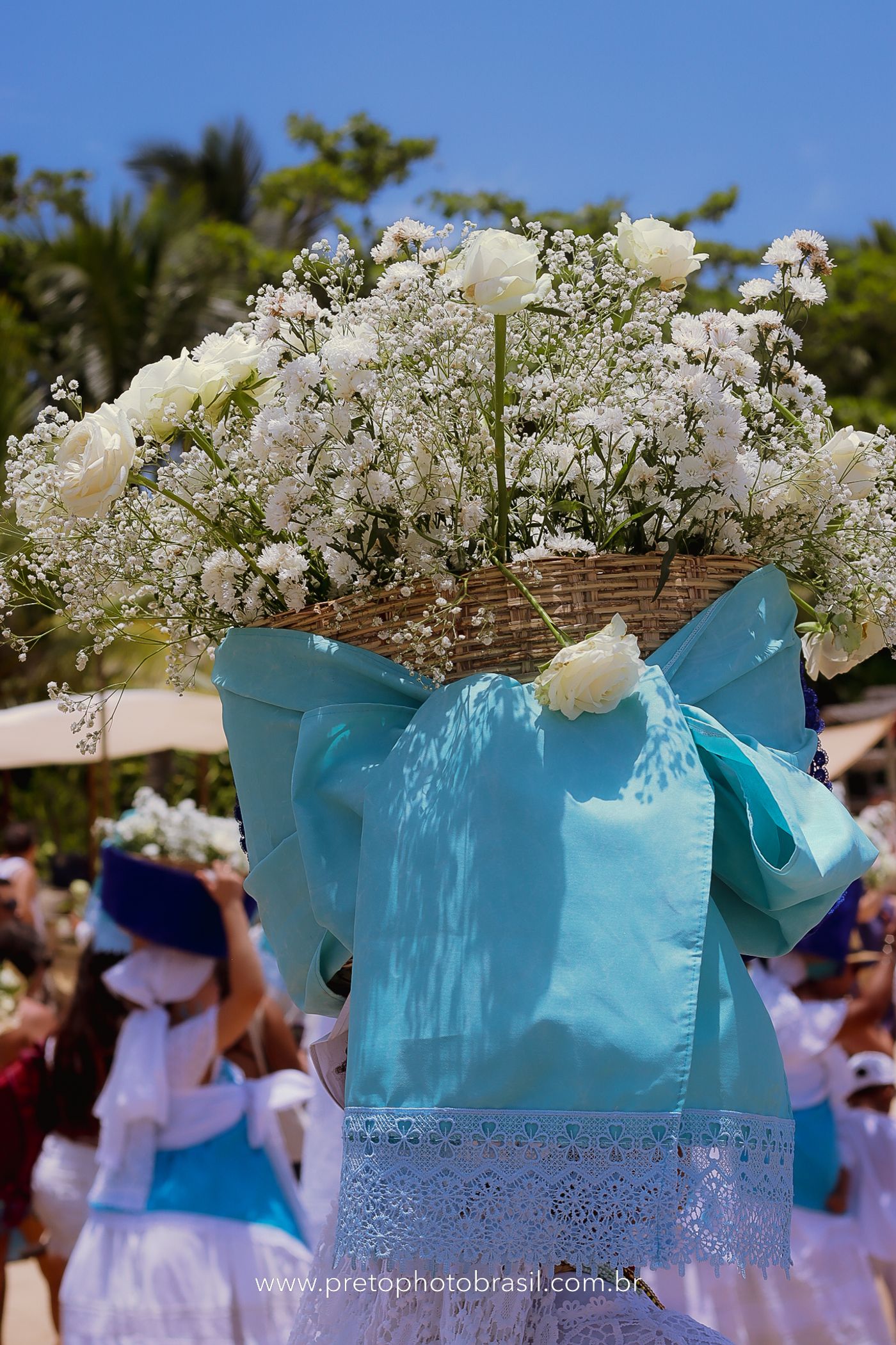 Descrição: Hoje, Trancoso foi tomada por um caminhar antigo e vivo. As baianas saíram em cortejo, com passos firmes e delicados, levando nos braços e sobre a cabeça cestos de flores brancas e azuis — oferendas de amor, fé e gratidão. O caminho até a praia não foi apenas físico: foi ritual. O terreiro do Pai Roni conduziu a celebração com respeito e força ancestral. Entre cantos, silêncios e sorrisos, a multidão se formou naturalmente — gente de todo canto, unida por um mesmo gesto de entrega. Havia muita gente, mas não havia pressa. Havia fé. Havia alegria. Na chegada ao mar, as flores encontraram o destino certo. Foram entregues às águas como quem devolve algo sagrado à origem. Iemanjá recebeu — no azul do céu, no branco das roupas, no brilho tranquilo dos olhos de quem participou. Foi um dia de corpo presente e espírito aberto. Uma festa que não se assiste: se atravessa. E eu tive a honra de registrar, em imagens, esse encontro entre tradição, devoção e vida pulsando junto.