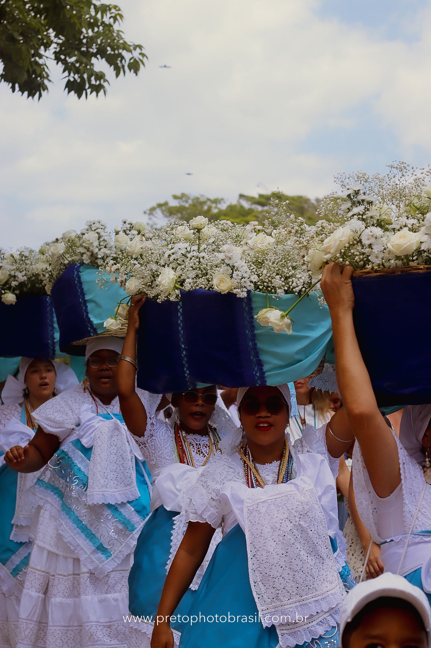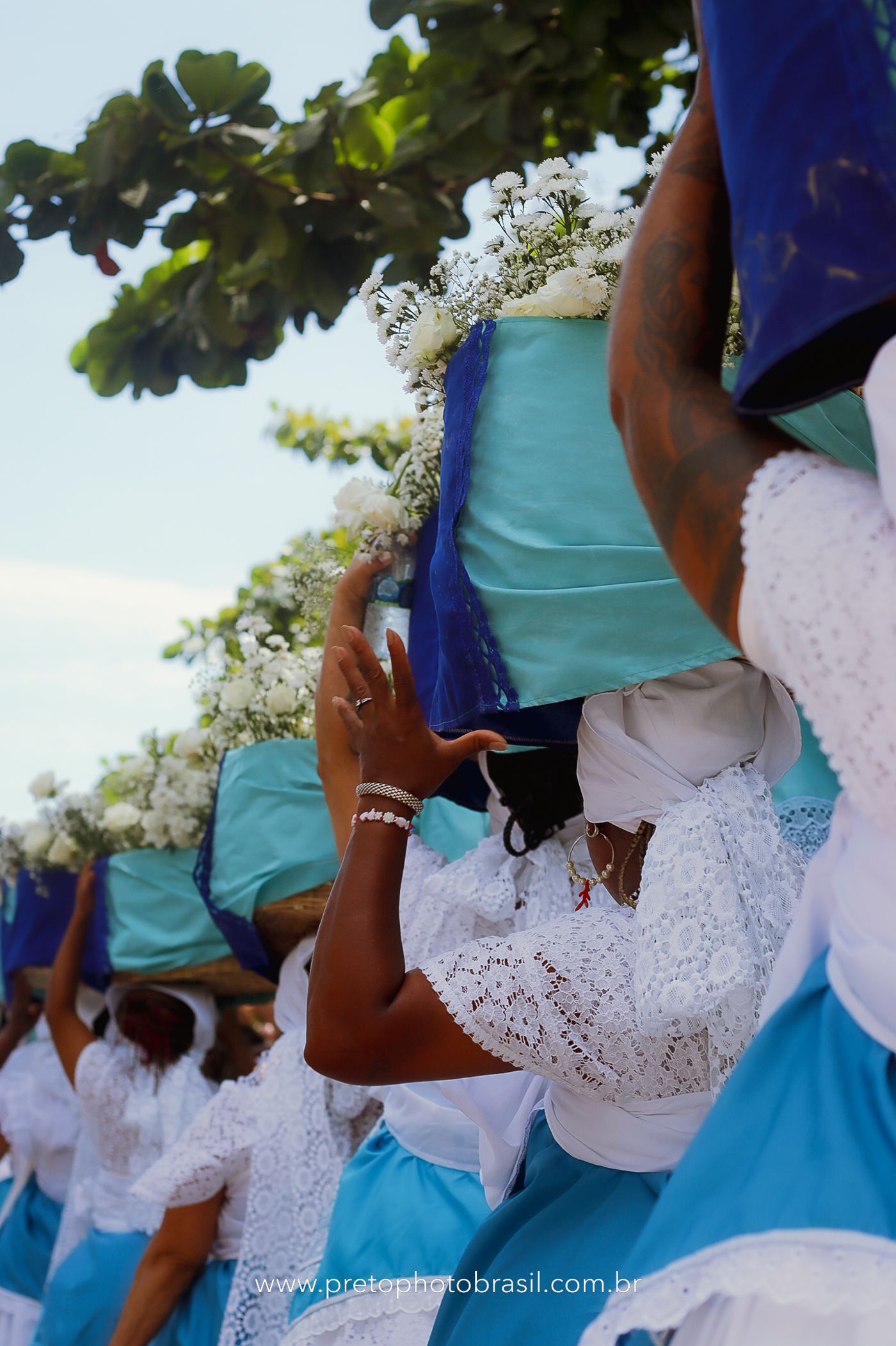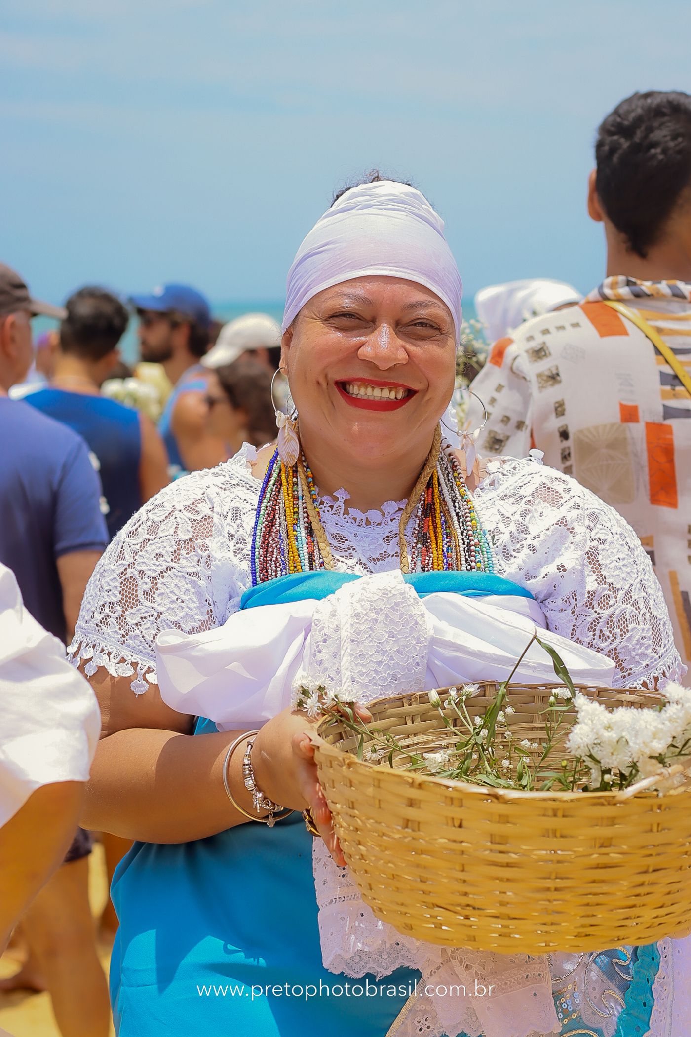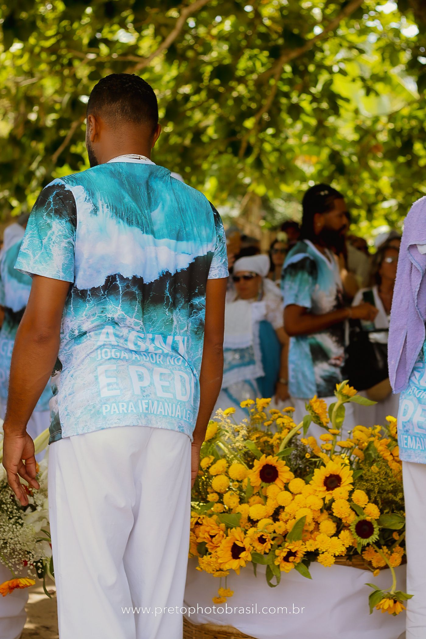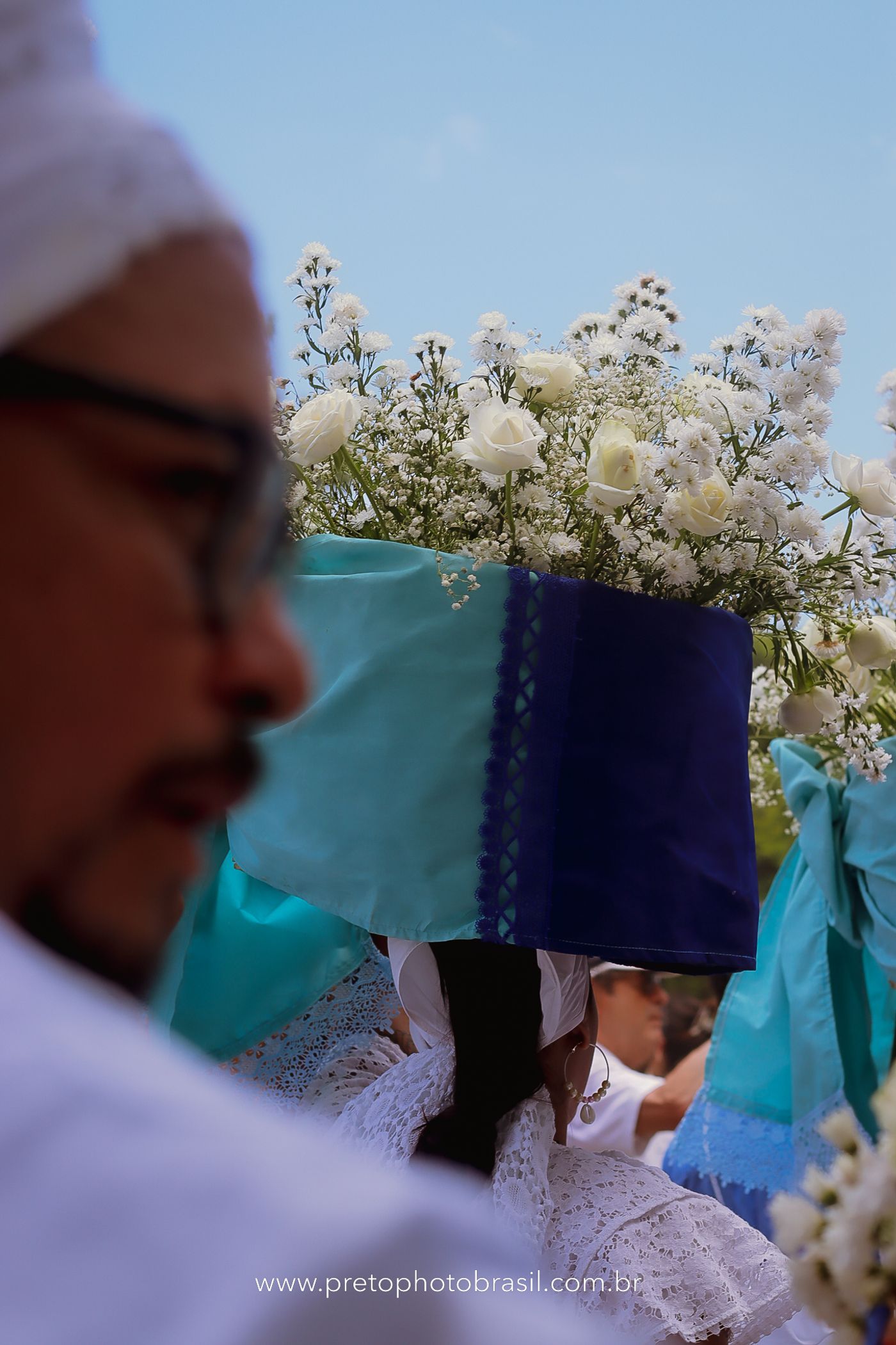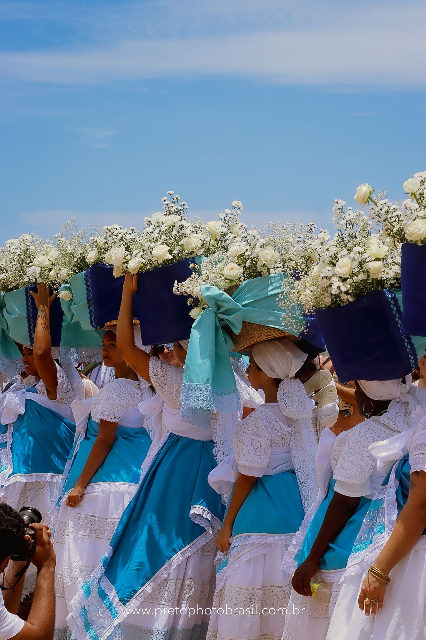 Descrição: Hoje, Trancoso foi tomada por um caminhar antigo e vivo. As baianas saíram em cortejo, com passos firmes e delicados, levando nos braços e sobre a cabeça cestos de flores brancas e azuis — oferendas de amor, fé e gratidão. O caminho até a praia não foi apenas físico: foi ritual. O terreiro do Pai Roni conduziu a celebração com respeito e força ancestral. Entre cantos, silêncios e sorrisos, a multidão se formou naturalmente — gente de todo canto, unida por um mesmo gesto de entrega. Havia muita gente, mas não havia pressa. Havia fé. Havia alegria. Na chegada ao mar, as flores encontraram o destino certo. Foram entregues às águas como quem devolve algo sagrado à origem. Iemanjá recebeu — no azul do céu, no branco das roupas, no brilho tranquilo dos olhos de quem participou. Foi um dia de corpo presente e espírito aberto. Uma festa que não se assiste: se atravessa. E eu tive a honra de registrar, em imagens, esse encontro entre tradição, devoção e vida pulsando junto.