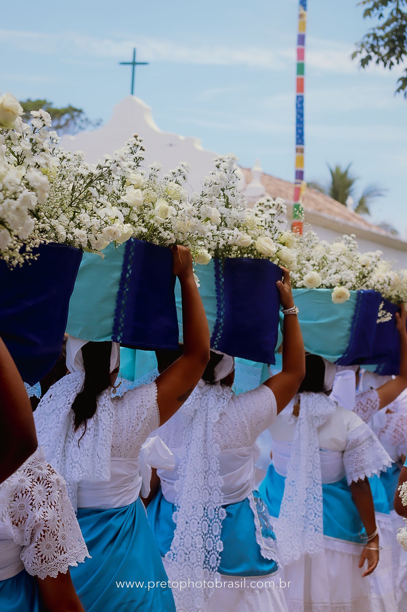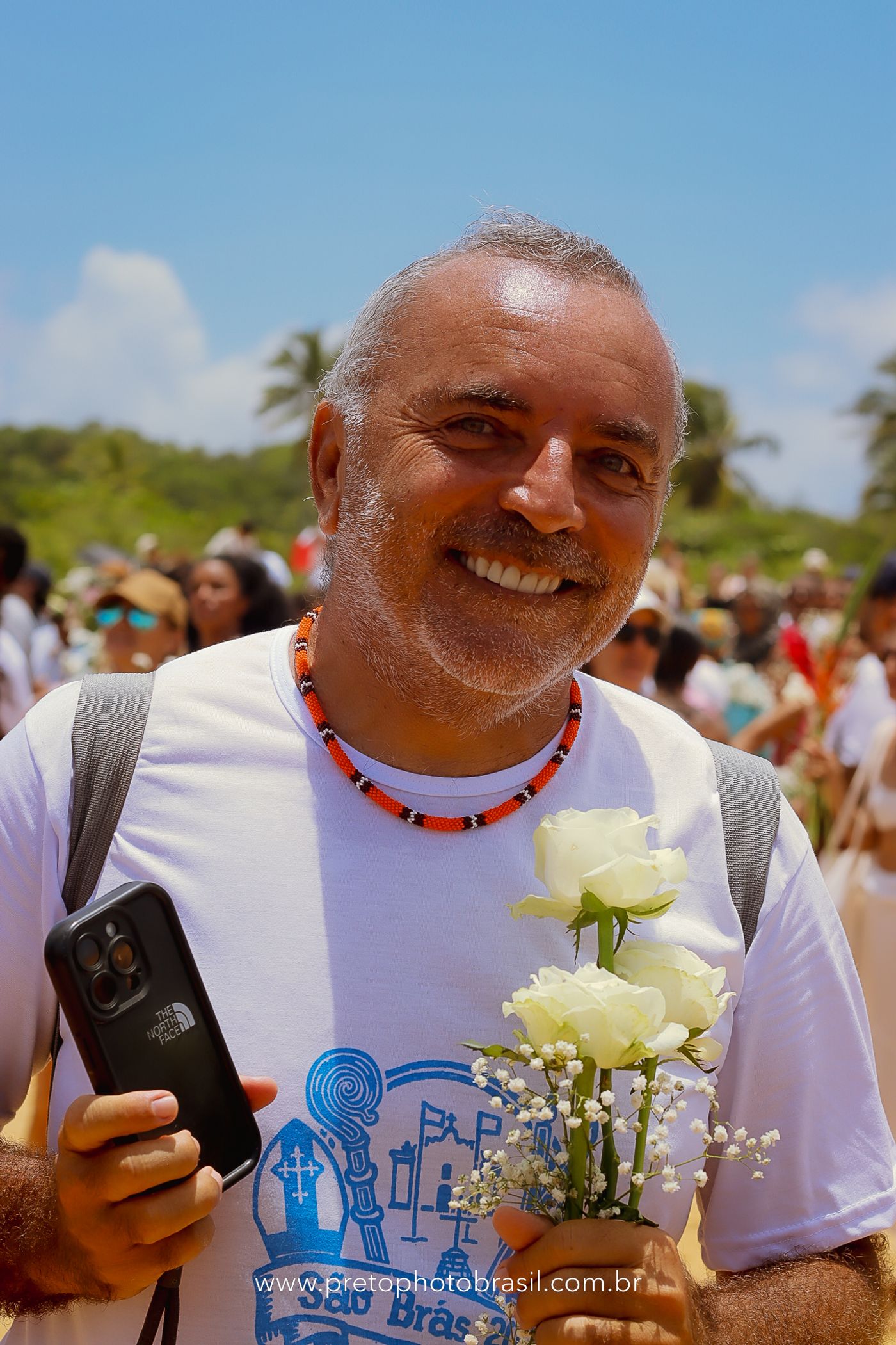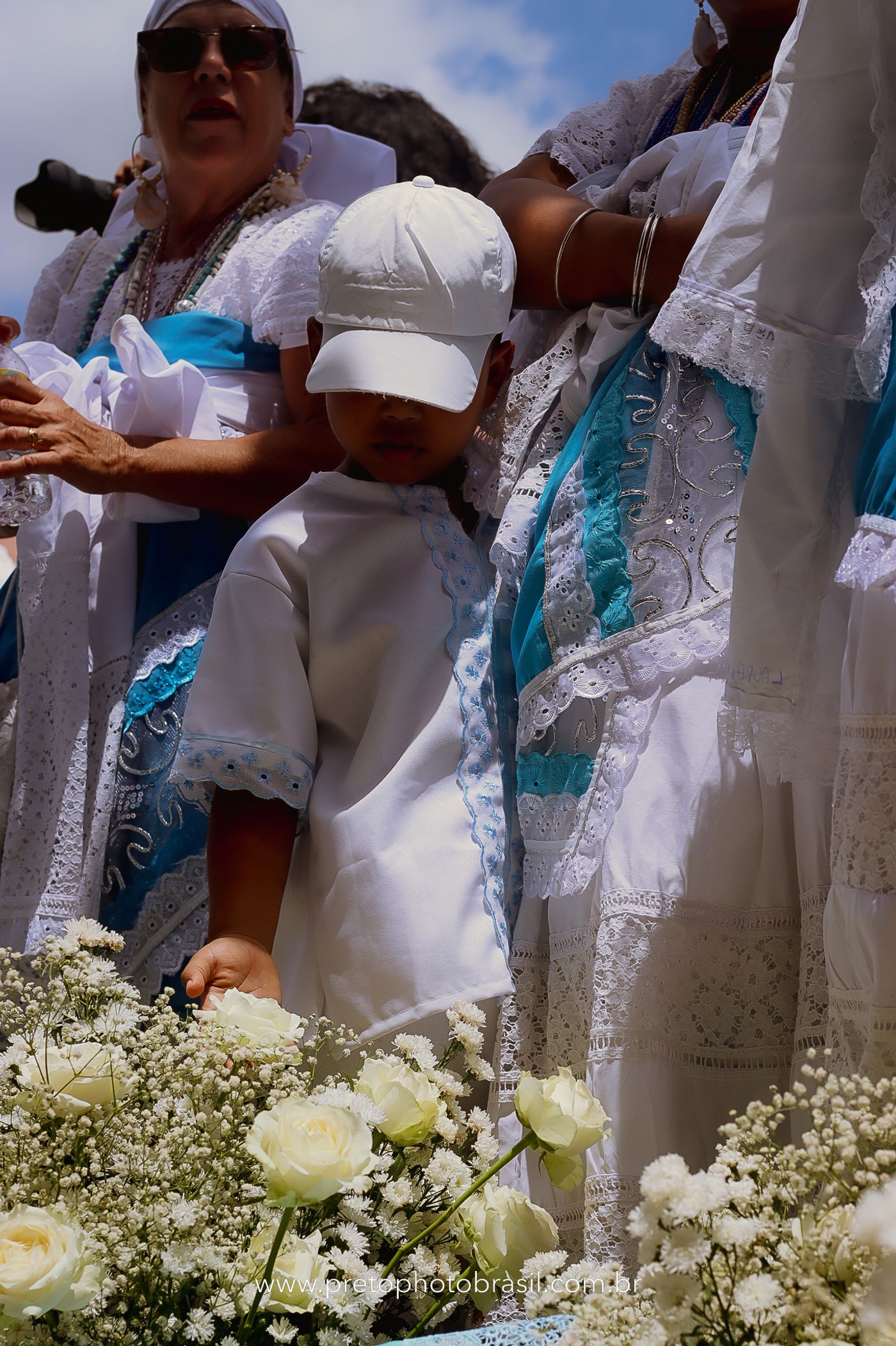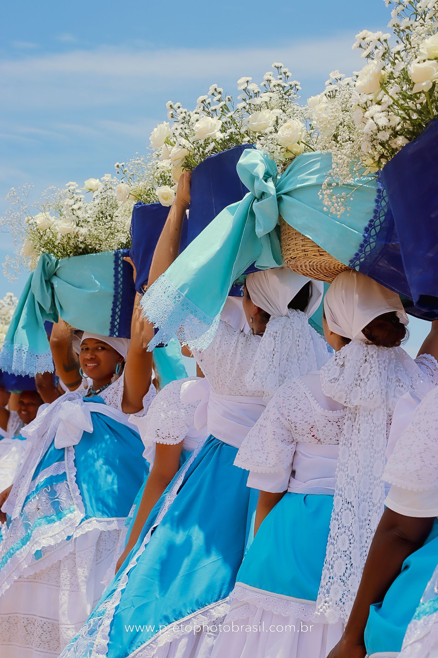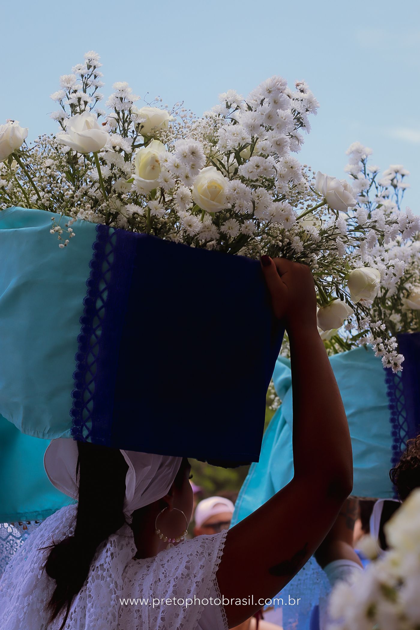 Descrição: Hoje, Trancoso foi tomada por um caminhar antigo e vivo. As baianas saíram em cortejo, com passos firmes e delicados, levando nos braços e sobre a cabeça cestos de flores brancas e azuis — oferendas de amor, fé e gratidão. O caminho até a praia não foi apenas físico: foi ritual. O terreiro do Pai Roni conduziu a celebração com respeito e força ancestral. Entre cantos, silêncios e sorrisos, a multidão se formou naturalmente — gente de todo canto, unida por um mesmo gesto de entrega. Havia muita gente, mas não havia pressa. Havia fé. Havia alegria. Na chegada ao mar, as flores encontraram o destino certo. Foram entregues às águas como quem devolve algo sagrado à origem. Iemanjá recebeu — no azul do céu, no branco das roupas, no brilho tranquilo dos olhos de quem participou. Foi um dia de corpo presente e espírito aberto. Uma festa que não se assiste: se atravessa. E eu tive a honra de registrar, em imagens, esse encontro entre tradição, devoção e vida pulsando junto.