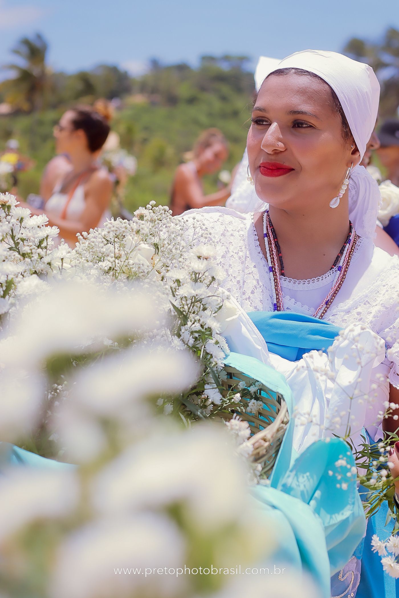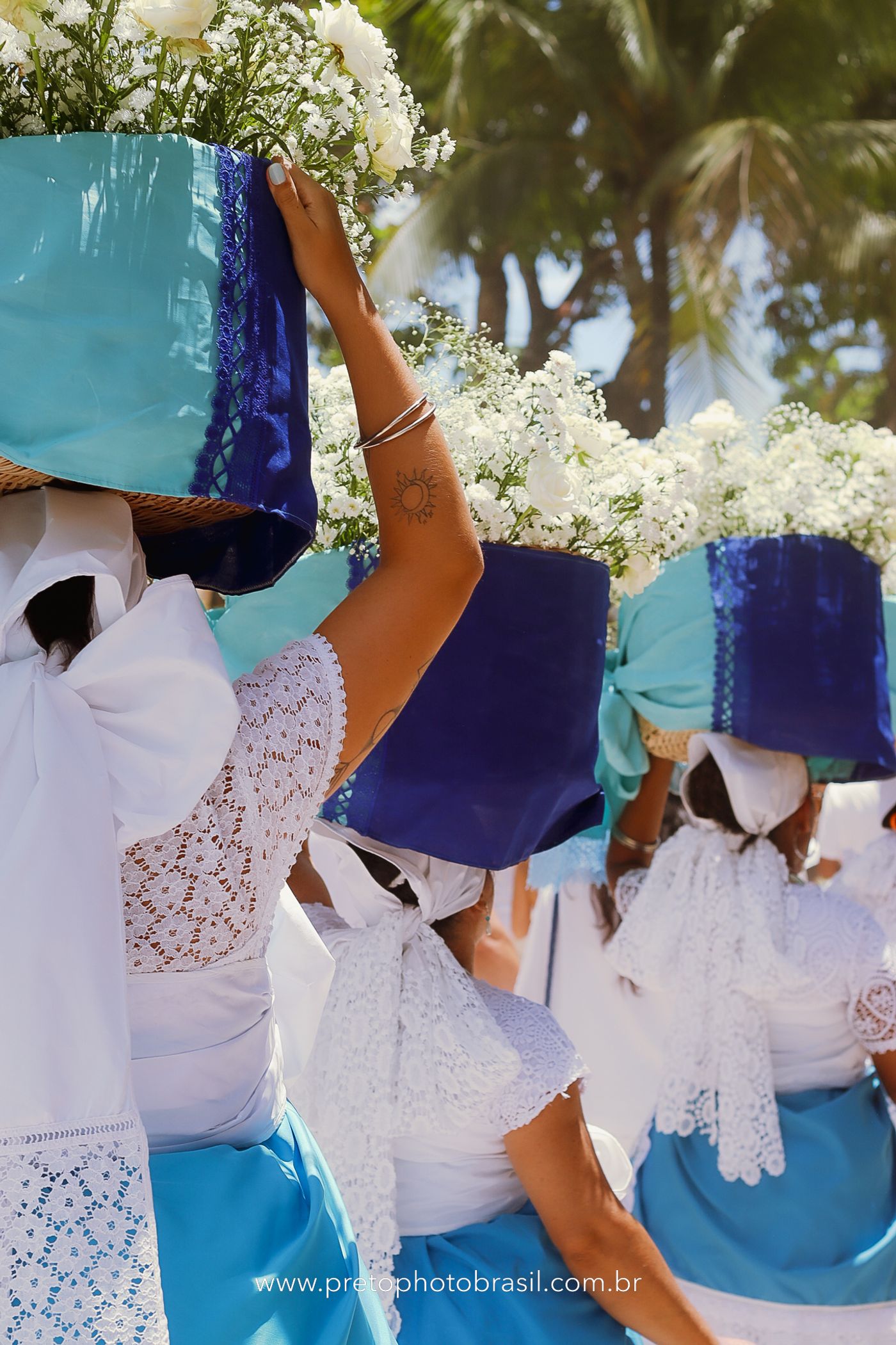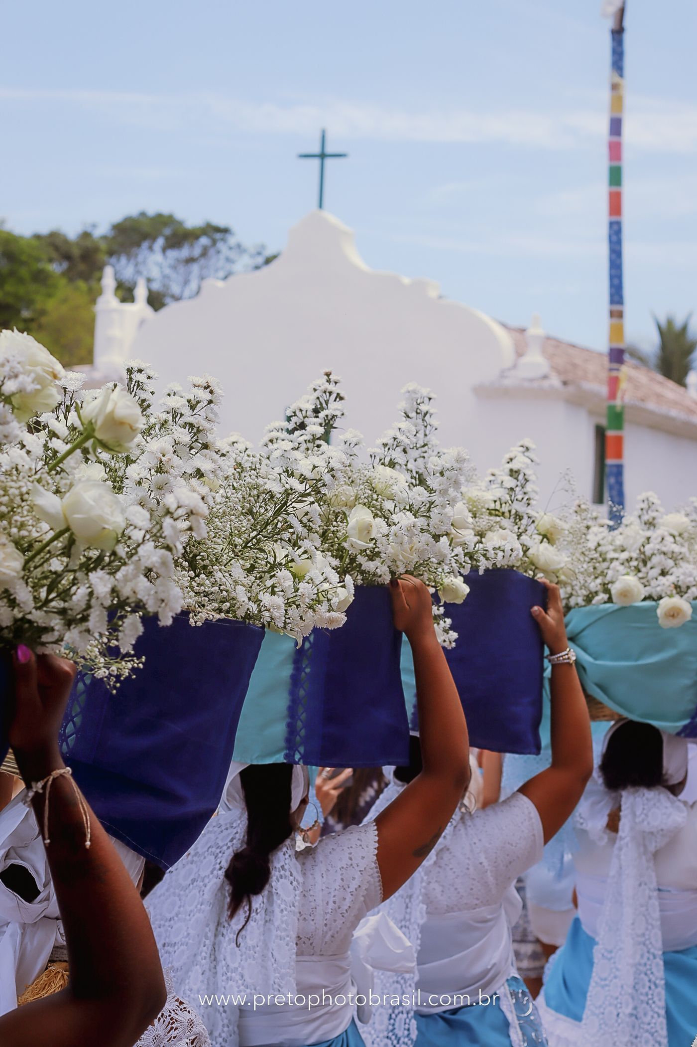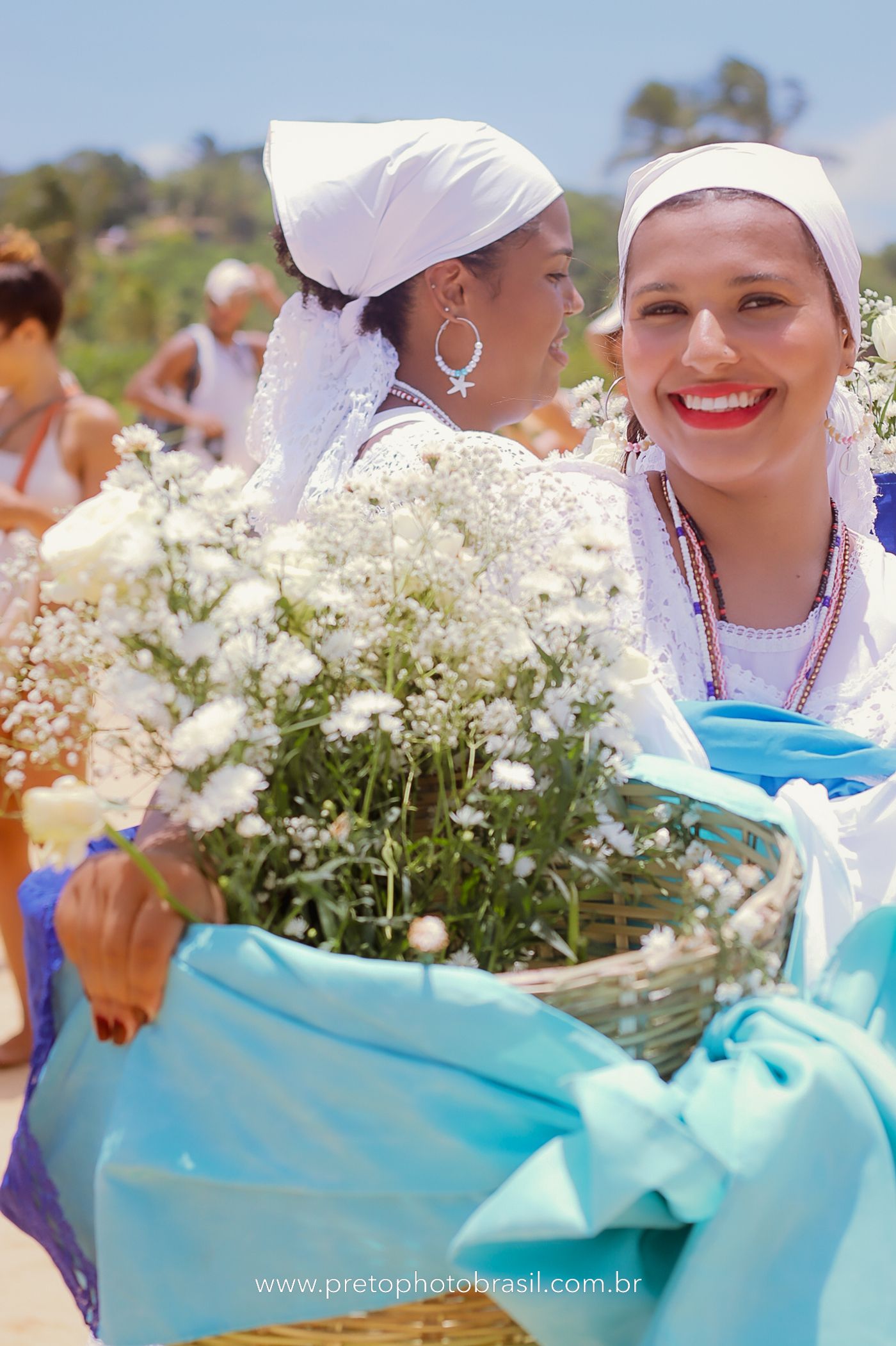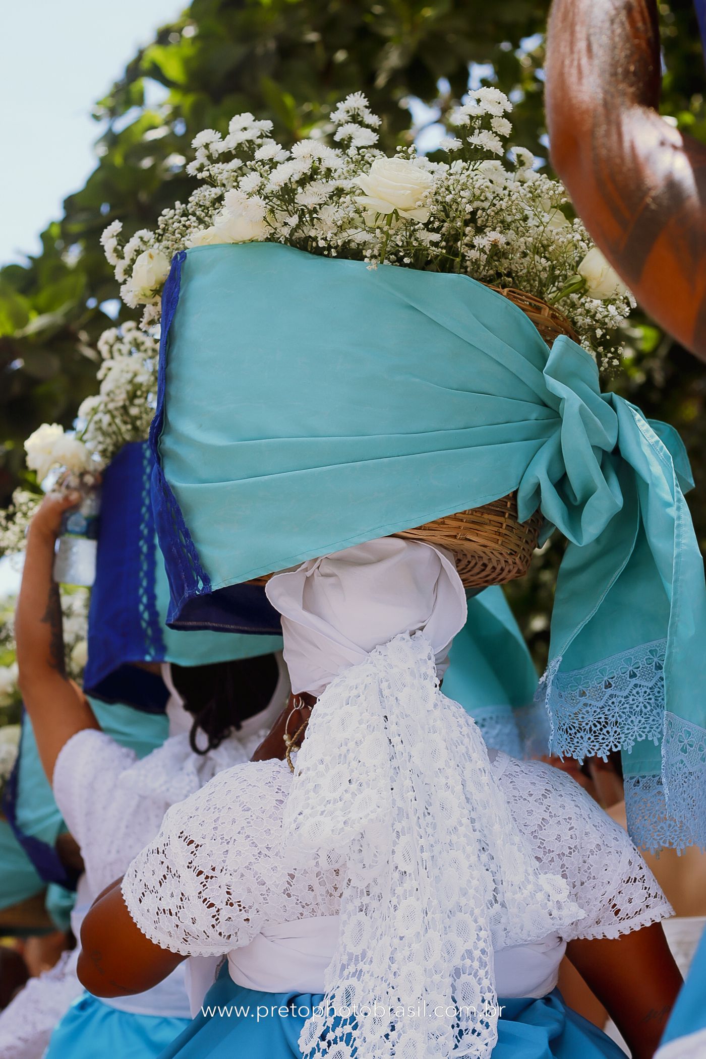 Descrição: Hoje, Trancoso foi tomada por um caminhar antigo e vivo. As baianas saíram em cortejo, com passos firmes e delicados, levando nos braços e sobre a cabeça cestos de flores brancas e azuis — oferendas de amor, fé e gratidão. O caminho até a praia não foi apenas físico: foi ritual. O terreiro do Pai Roni conduziu a celebração com respeito e força ancestral. Entre cantos, silêncios e sorrisos, a multidão se formou naturalmente — gente de todo canto, unida por um mesmo gesto de entrega. Havia muita gente, mas não havia pressa. Havia fé. Havia alegria. Na chegada ao mar, as flores encontraram o destino certo. Foram entregues às águas como quem devolve algo sagrado à origem. Iemanjá recebeu — no azul do céu, no branco das roupas, no brilho tranquilo dos olhos de quem participou. Foi um dia de corpo presente e espírito aberto. Uma festa que não se assiste: se atravessa. E eu tive a honra de registrar, em imagens, esse encontro entre tradição, devoção e vida pulsando junto.
