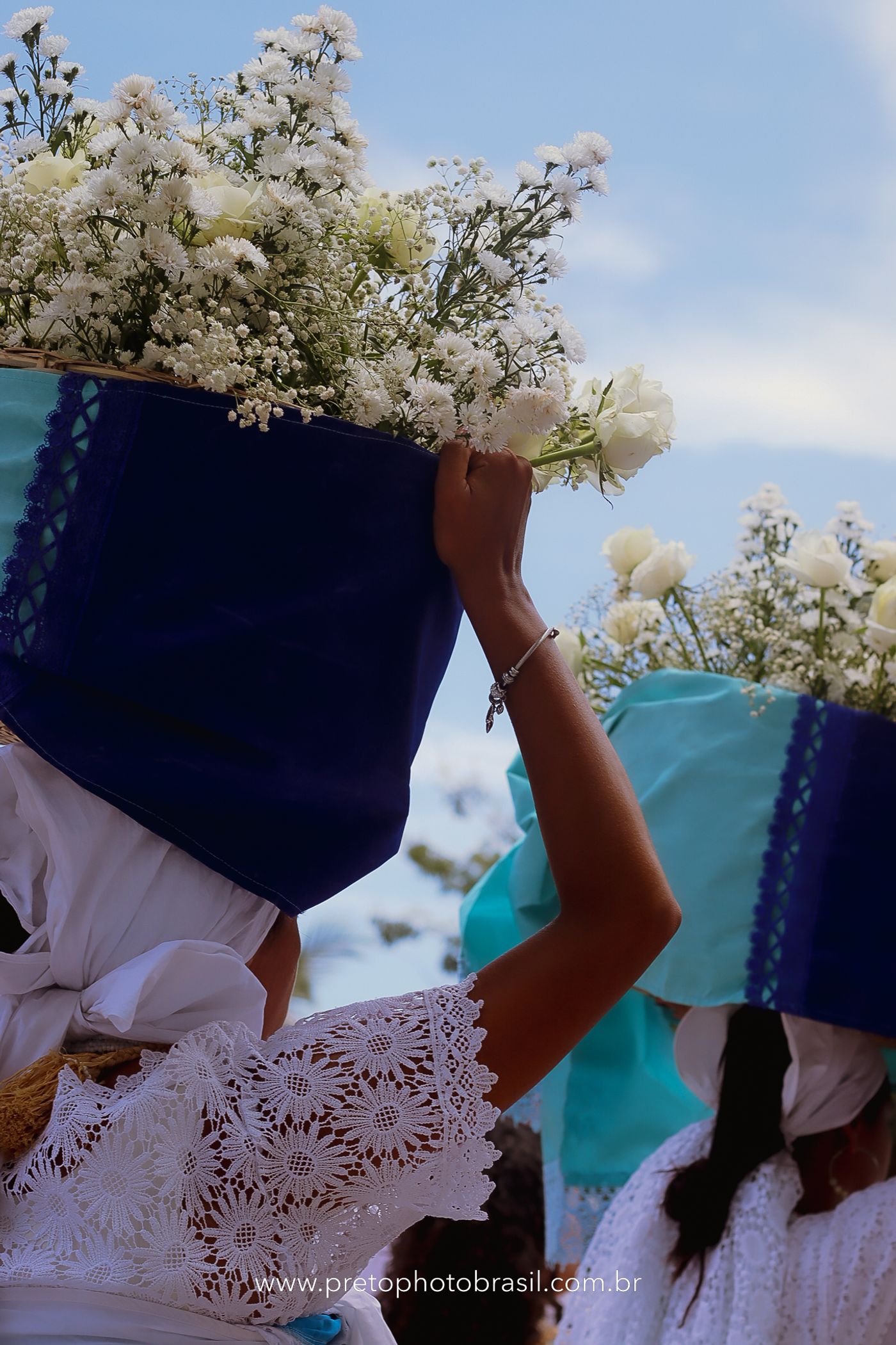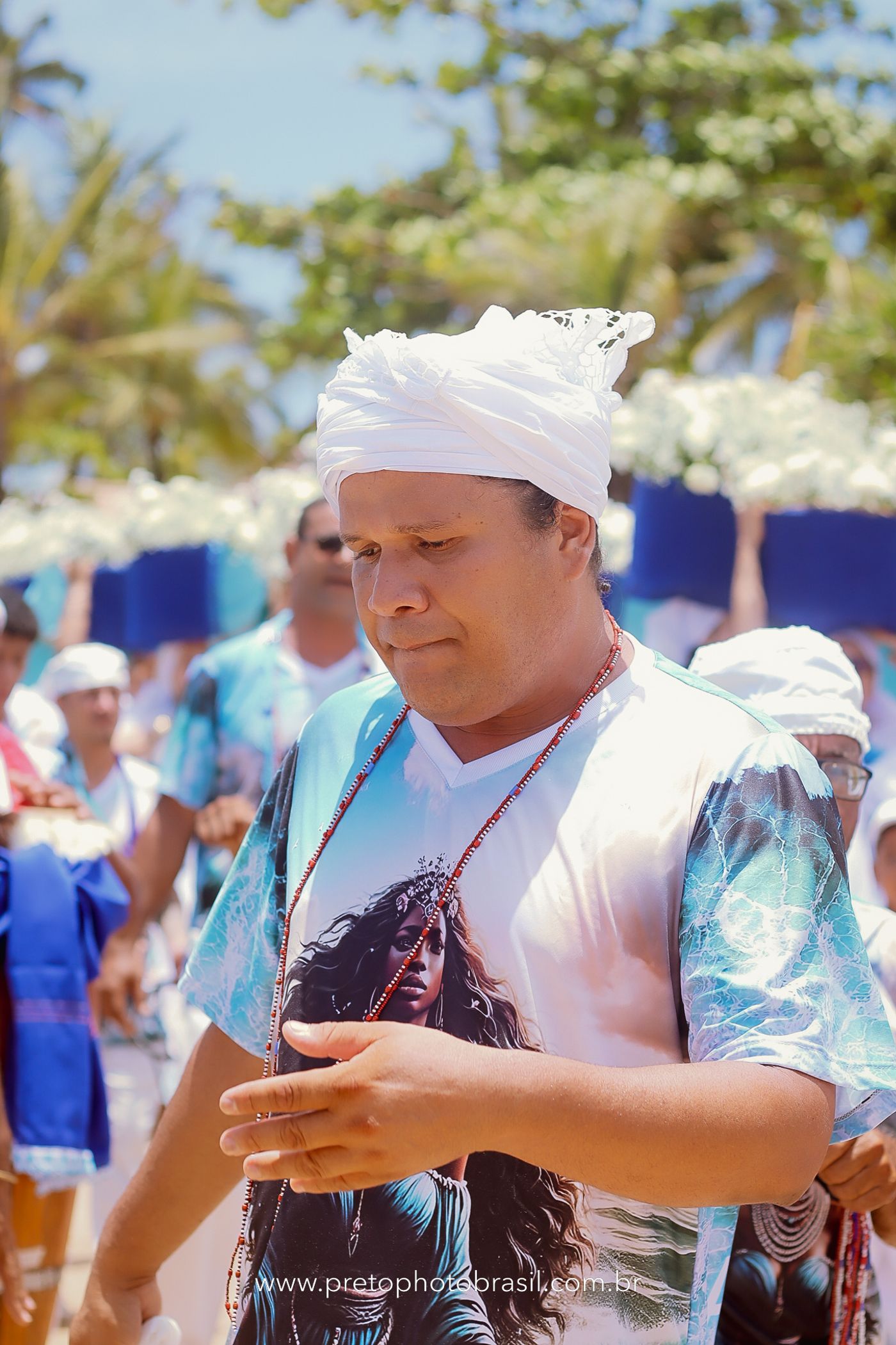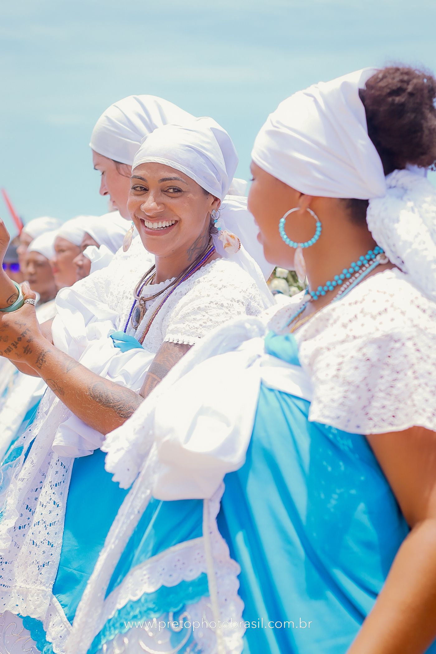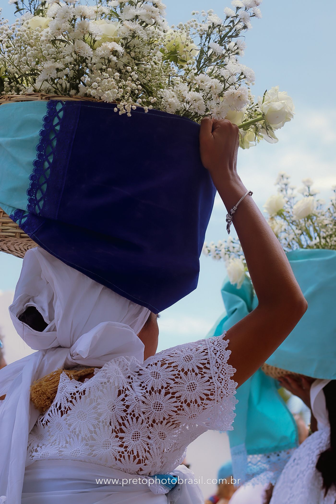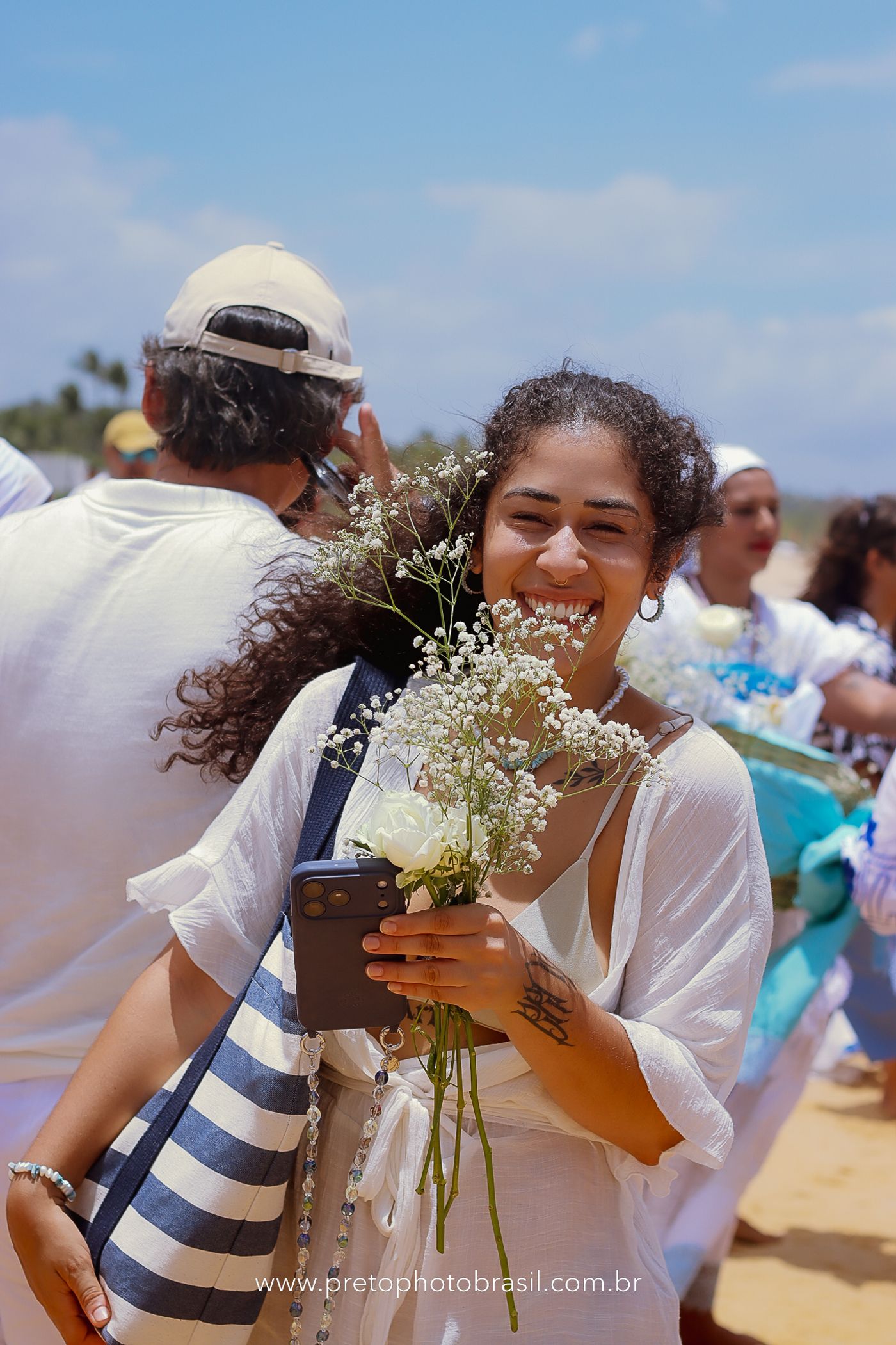 Descrição: Hoje, Trancoso foi tomada por um caminhar antigo e vivo. As baianas saíram em cortejo, com passos firmes e delicados, levando nos braços e sobre a cabeça cestos de flores brancas e azuis — oferendas de amor, fé e gratidão. O caminho até a praia não foi apenas físico: foi ritual. O terreiro do Pai Roni conduziu a celebração com respeito e força ancestral. Entre cantos, silêncios e sorrisos, a multidão se formou naturalmente — gente de todo canto, unida por um mesmo gesto de entrega. Havia muita gente, mas não havia pressa. Havia fé. Havia alegria. Na chegada ao mar, as flores encontraram o destino certo. Foram entregues às águas como quem devolve algo sagrado à origem. Iemanjá recebeu — no azul do céu, no branco das roupas, no brilho tranquilo dos olhos de quem participou. Foi um dia de corpo presente e espírito aberto. Uma festa que não se assiste: se atravessa. E eu tive a honra de registrar, em imagens, esse encontro entre tradição, devoção e vida pulsando junto.